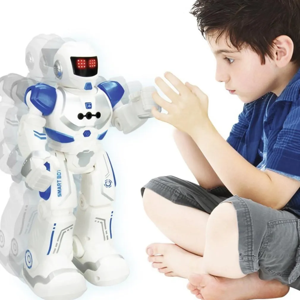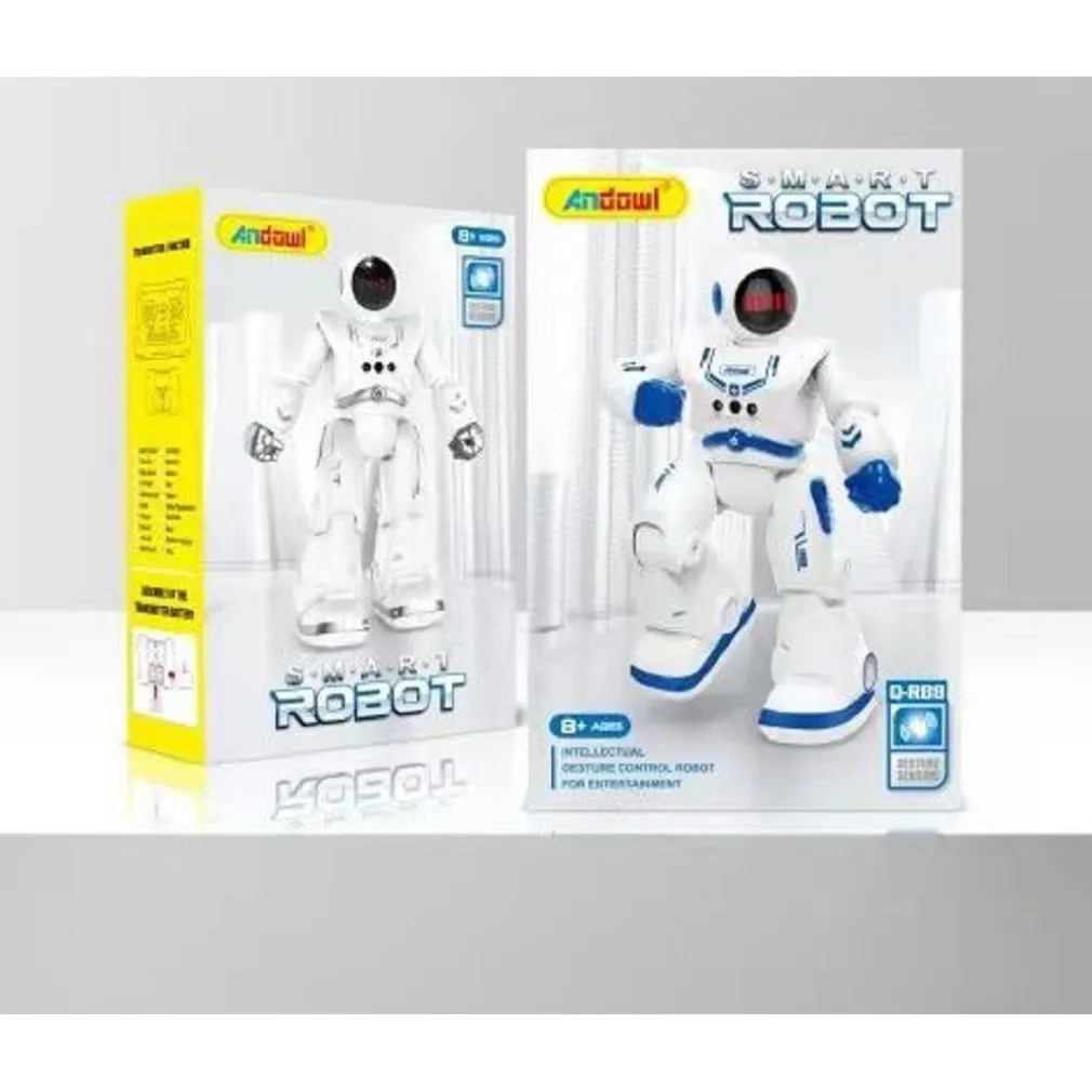 Smart Bot è ricco di funzioni, puoi controllarlo in 2 modi attraverso l’apposito teleomando ad infrarossi oppure tramite il controllo a gesti, muovi la mano in avanti per fare avanzare il robot, posizionala di fronte per farlo andare indietro, muovila a destra/sinistra per farlo ruotare. Può eseguire fino a 50 azioni programmabili, buo ballare e parlare con la sua voce robotica, i suoi occhi con led possono esprimere diverse espressioni facciali, ha 2 modalità di movimento, può camminare e scivolare e la velocità di movimento e il volume sono regolabili.