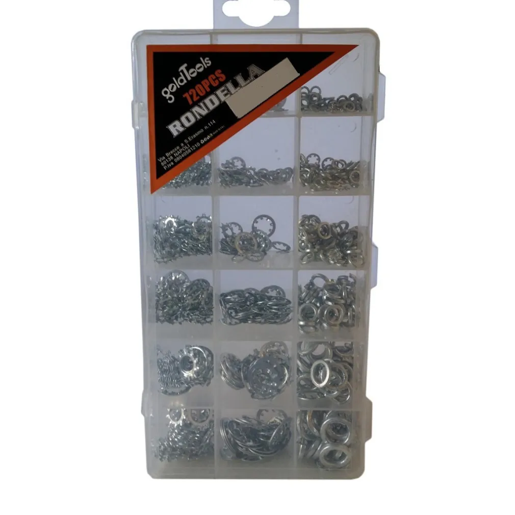 Pratico comodo e vantaggioso kit in scatola di ben 720 pz di rondelle assortie in acciaio e di varie misure e utili per molteplici scopi. Rondelle di varie tipologie, da quella liscia a quella dentanta, a quella a stella interna. Set assortito in pratica scatola in plastica per riporle o per portarle durante riparazioni esterne.