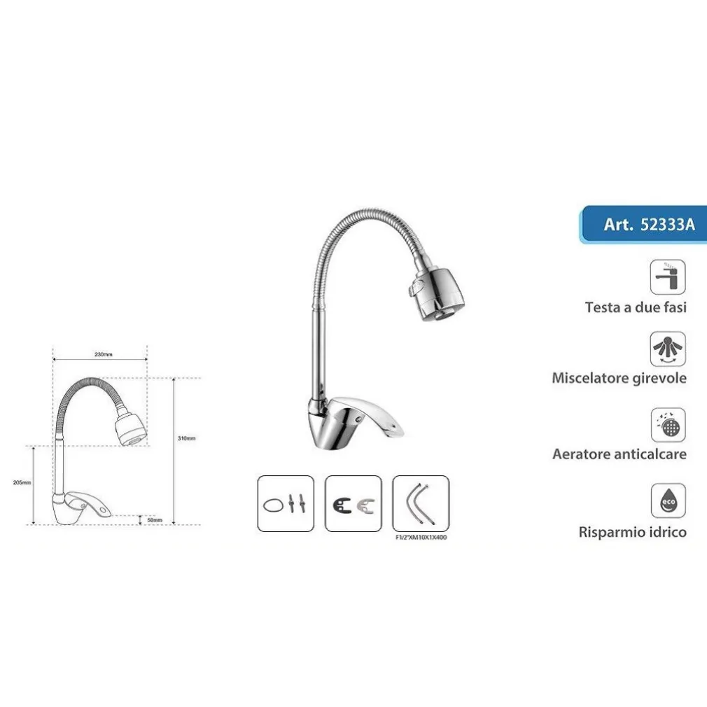 Miscelatore per lavello da cucina con struttura a canna alta flessibile ideale per posizionare la canna del rubinetto in base alle vostre esigenze e risciacquare stoviglie, frutta e verdura con estrema facilità. Realizzato in ottone cromato lucido, viene fornito con due flessibili e tutti gli accessori per l’installazione. Dotato di doccetta a doppio getto con interruttore a leva per selezionare il getto d’acqua che più desiderate. Tramite il pulsante è possibile, infatti, scegliere fra il classico getto da rubinetto oppure uno simile a quello della doccia. Grazie alla canna orientabile è utilizzabile sia per lavelli ad una vasca che a due vasche.