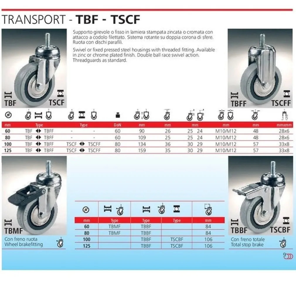 RUOTA GRIGIA CON PERNO E FRENO TBBF CEBORA DIAMETRO 60 80 100 125