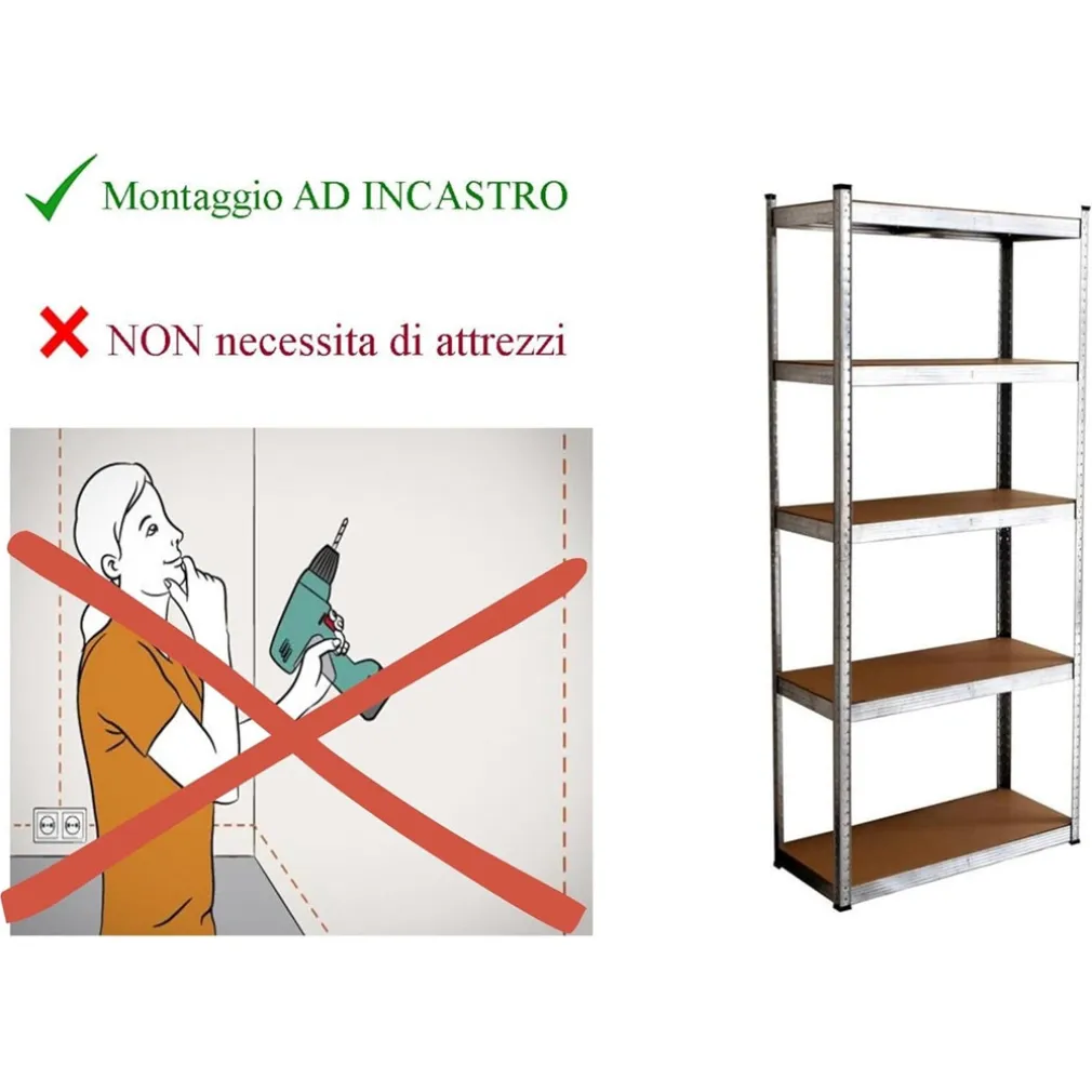 Lo scaffale è ideale per garage, cantine, lavanderie, cucine, negozi, attività commerciali, ripostigli e officine. Grazie alla sua finitura zincata, resiste bene anche in ambienti soggetti a umidità.
