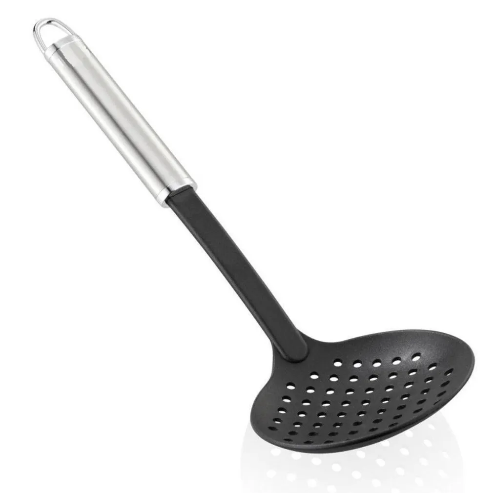 Un design snello ed elegante abbinato all’acciaio di alta qualità: Le impugnature opaco scintillanti degli strumenti da cucina ricordano la resistenza e la brillantezza dell’intramontabile argento. Sono strumenti perfetti per servire in tavola e soddisfano le esigenze con la loro maneggevolezza. La finitura in nylon resistente al calore (fino a 160°C) protegge le superfici delicate di padelle e tegami rivestiti. L’impugnatura ovale della schiumarola rimane comodamente e saldamente in mano. Inoltre l’acciaio di alta qualità conferisce una piacevole stabilità.
