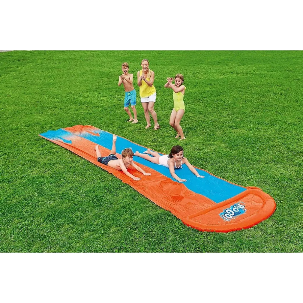 Questo scivolo è stato progettato appositamente per il classico divertimento estivo in giardino. E’ dotato di 2 corsie, consentendo quindi a 2 bambini di sfidarsi e di scivolare in velocità senza intoppi fino al traguardo nella piscinetta finale in un trionfo di spruzzi. Gli spruzzatori integrati producono infatti un effetto cascata per regalare e mantenere le corsie sempre bagnate. I bambini non potranno che amare questo scivolo ed i genitori sapranno apprezzare quanto sia semplice da installare, basta infatti collegarlo un tubo da giardino e il divertimento ha inizio.