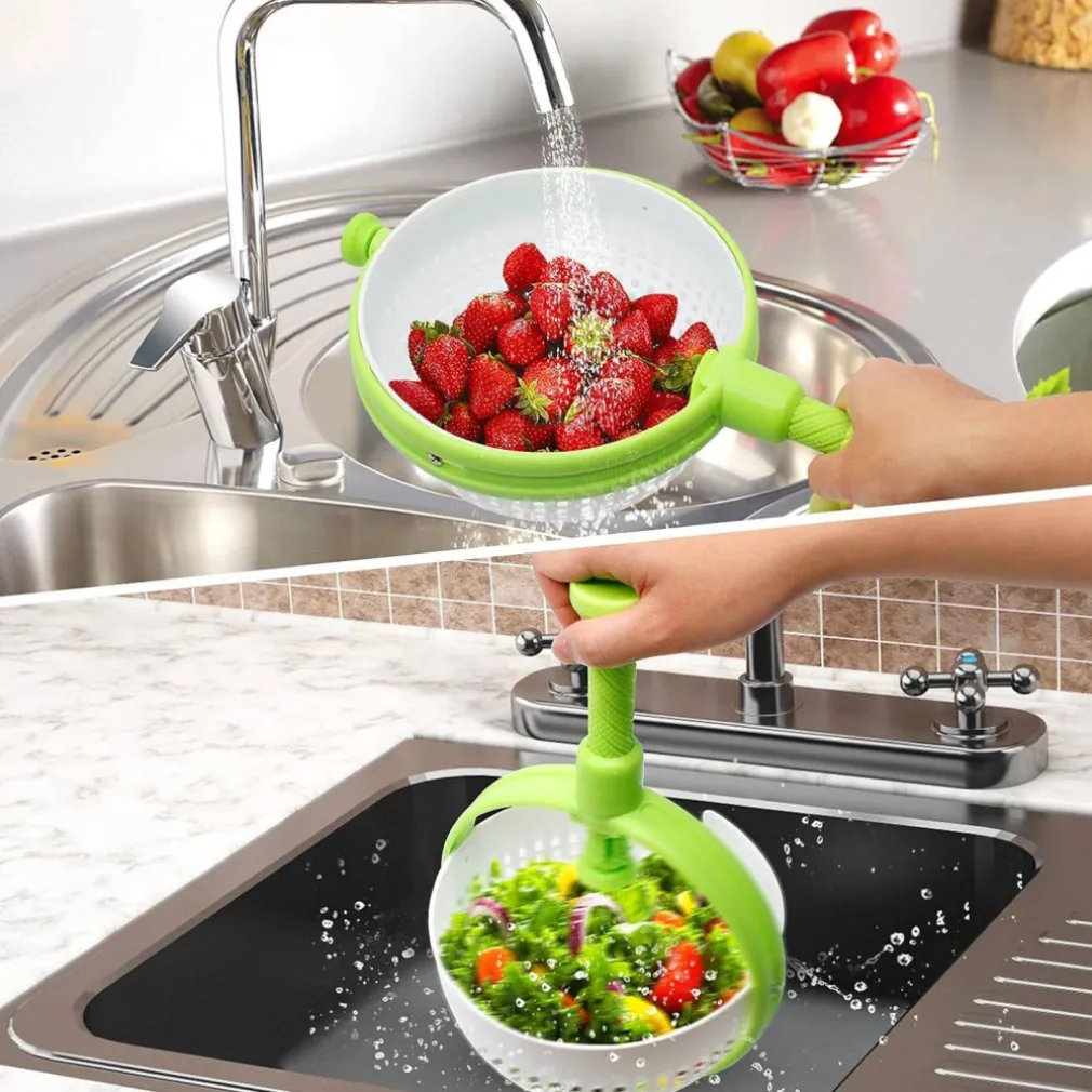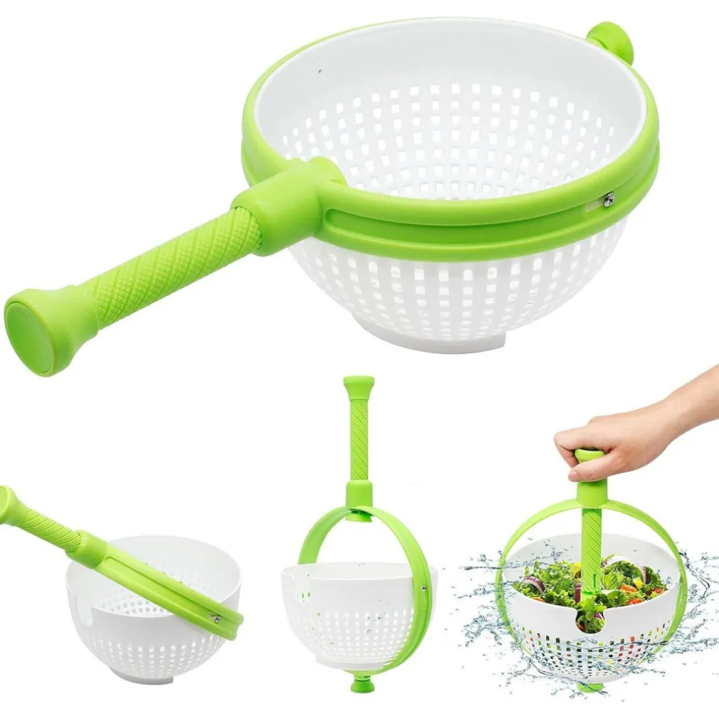 Uno scolapasta con una torsione: niente più agitare o asciugare a goccia le foglie di insalata, il manico a pompa ruota lo scolapasta rotante, asciugando i prodotti in pochi secondi.