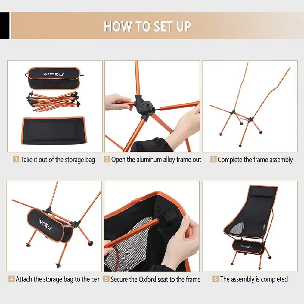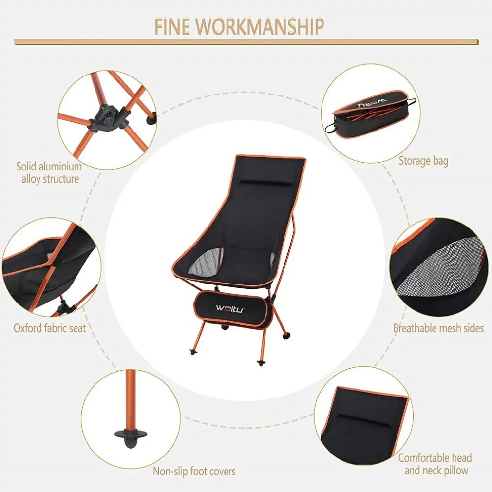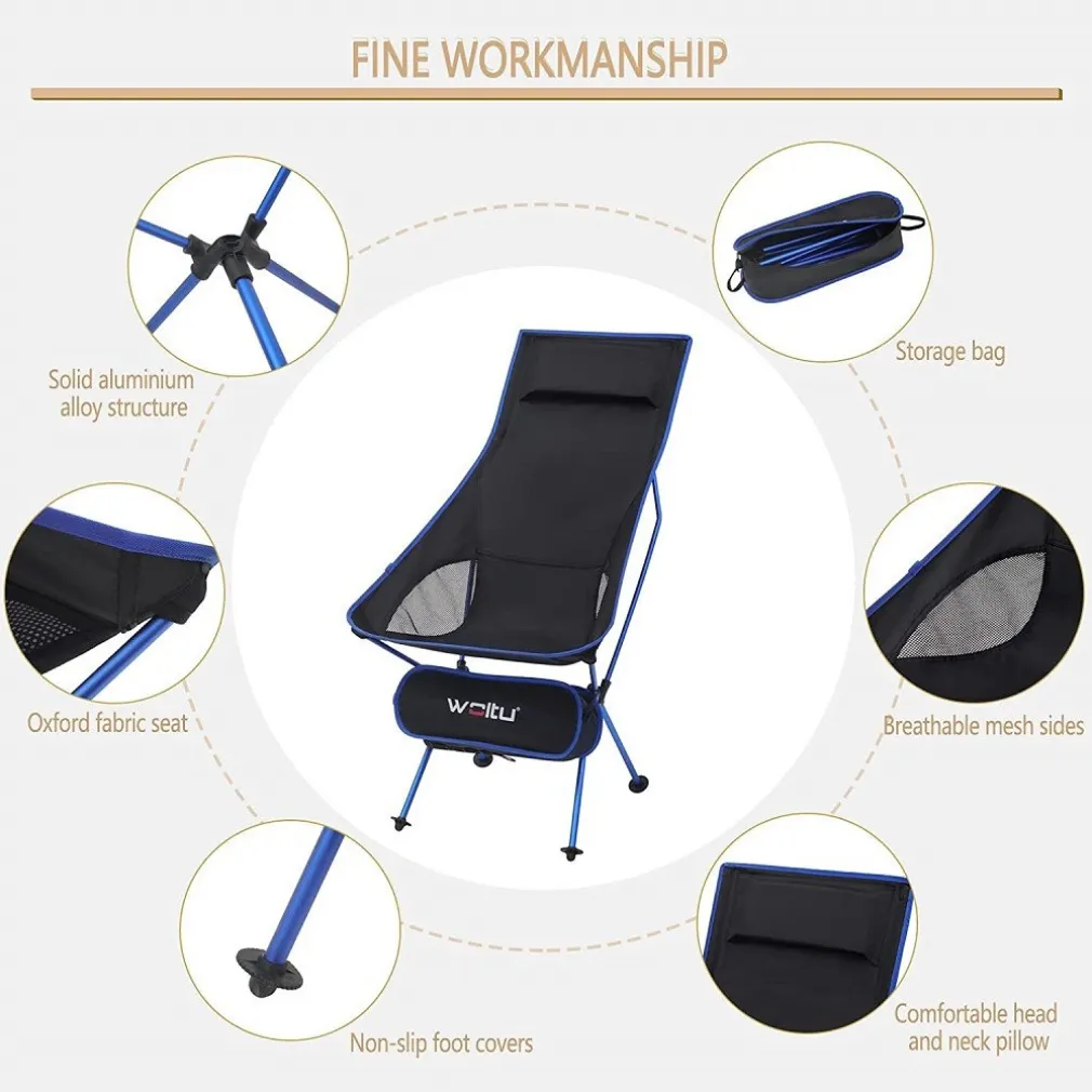 Quando vai a pesca, in campeggio, a fare escursioni, in spiaggia o altri posti, non dimenticarti di portare con te la sedia pieghevole! Con materiali di alta qualità, cuciture sofisticate, design ergonomico, peso leggero, struttura ripiegabile e custodia, non ingombra troppo spazio ma è super pratica! È un must per la casa e per le gite all’aperto! La struttura in alluminio è solida, leggera e robusta, mentre la seduta in tessuto è resistente e traspirante. Realizzati in plastica ABS, i piedini sono antiscivolo e resistenti all’usura, adatti a una varietà di terreni. Il tessuto a rete su entrambi i lati della sedia da campeggio è traspirante e dissipa il calore; lo schienale è ergonomico e il poggiatesta imbottito in schiuma è morbido e confortevole; la seduta scura con bordi accesi è antimacchia e rende la sedia pieghevole più vivace; l’ampia base aumenta la stabilità; la custodia inclusa può essere riposta comodamente sotto la sedia. Per risparmiare spazio e rendere più facile lo stoccaggio o il trasporto, puoi piegare facilmente la sedia pieghevole da esterno e riporla nella custodia in dotazione. Formata da materiali resistenti e con un peso leggero, la sedia pieghevole portatile non è adatta solo per le riunioni famigliari, ma può anche essere utilizzata per escursioni, alpinismo, spiaggia, campeggio, pesca, ecc. Apri il telaio, sistema la seduta e la sedia da spiaggia è pronta per l’uso!