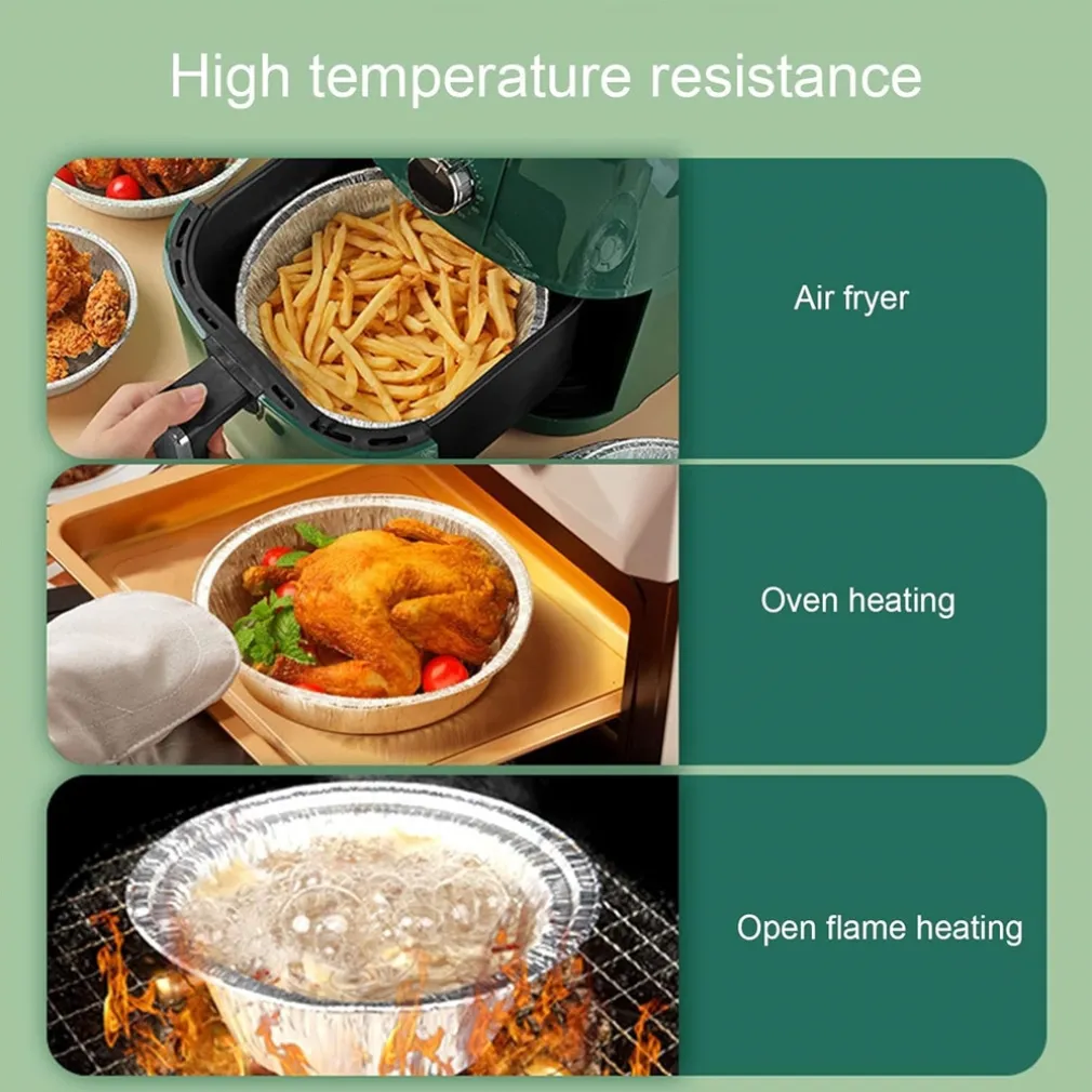 L’immagine mostra delle vaschette rotonde in alluminio, comunemente utilizzate come rivestimenti per friggitrici ad aria o come contenitori per alimenti. Sono realizzate in alluminio di alta qualità, robuste, antiaderenti e perfettamente resistenti a temperature elevate.