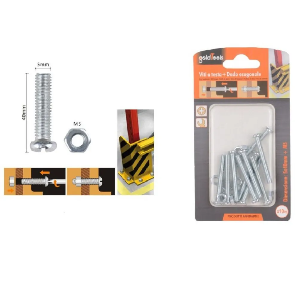 Ogni vite misura 5 x 40 mm ed è dotata di una testa a croce tonda che consente di serrare facilmente la vite anche in spazi ristretti. Il set include anche i dadi esagonali M5, perfetti per fissare saldamente la vite su qualsiasi tipo di superficie.