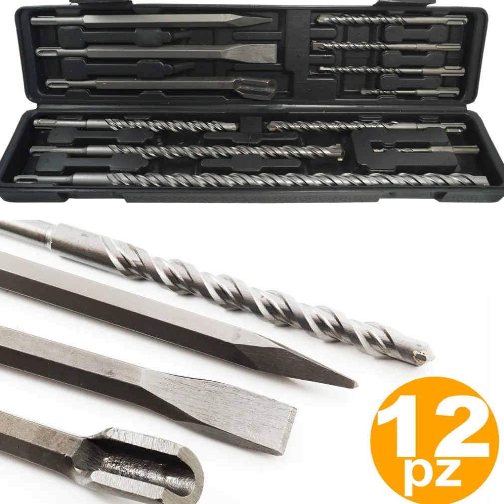 Set da 12 punte per trapano martello pneumatico demolitore, a incasso, ideali per operatori del settore dell’edilizia, possono essere applicati a tutti i trapani e demolitori con attacchi ad incasso come da foto.