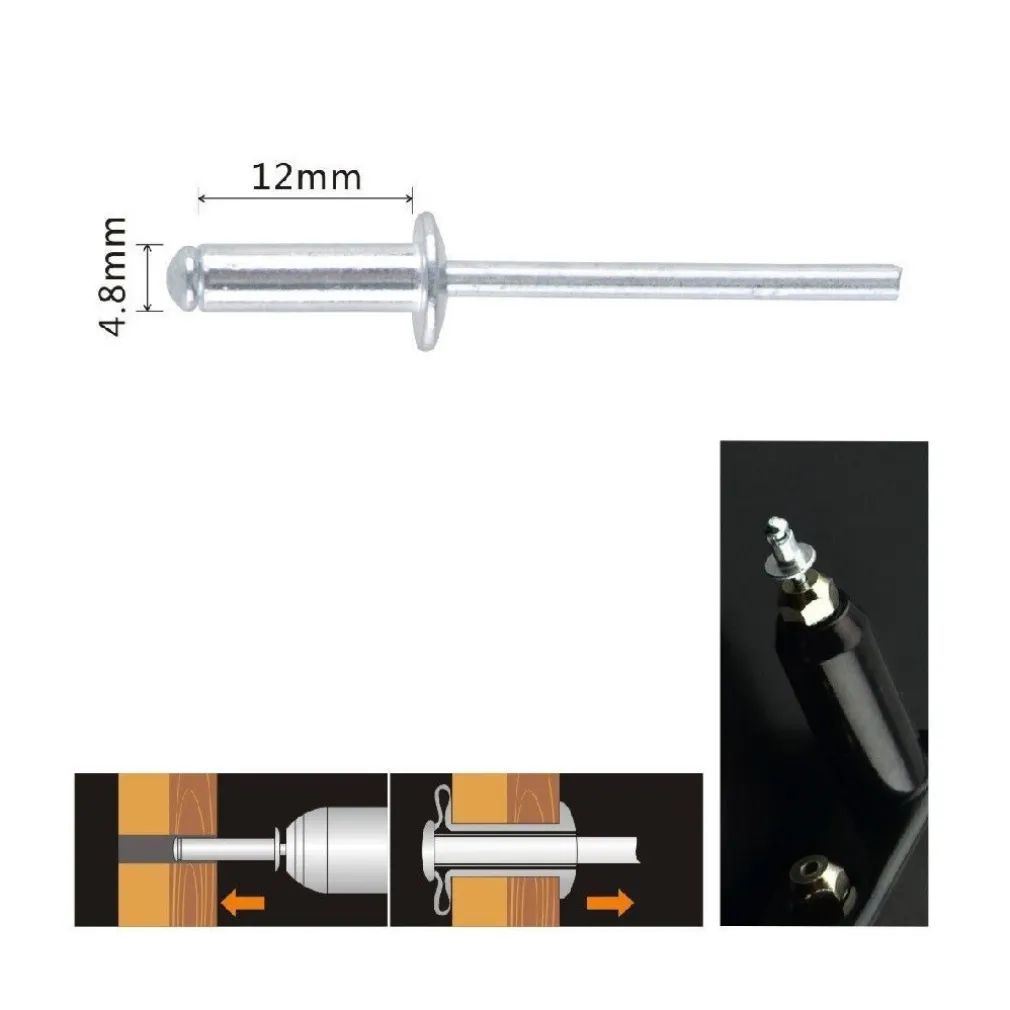 I nostri rivetti sono realizzati con la massima precisione e attenzione ai dettagli, per assicurare prestazioni ottimali in qualsiasi progetto. La dimensione 4.8x12mm li rende versatili e adatti a una vasta gamma di applicazioni.