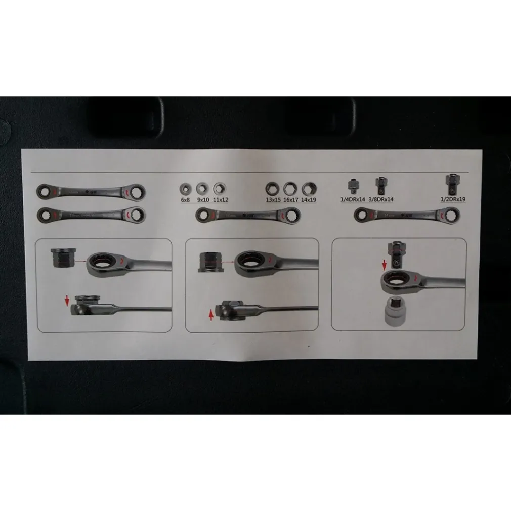 Nuovissimo set multiuso con chiave a cricchetto (non reversibile sul singolo lato ma bisogna capovolgerla). Ideale per professionisti nel settore della meccanica.