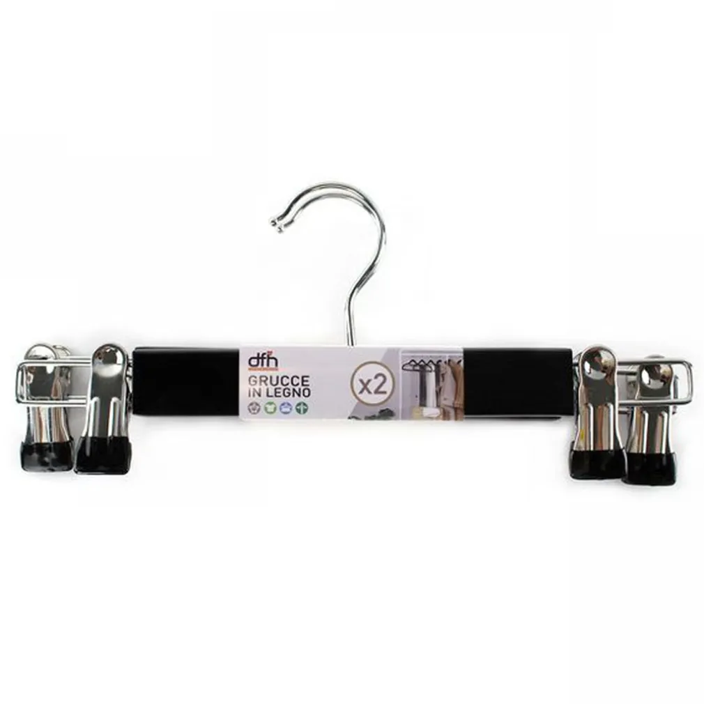 Set 2 grucce per pantaloni fashion in legno. Le grucce nere hanno due clip antiscivolo e renderanno il tuo armadio più ordinato ed allegro. Comode e soprattutto salvaspazio, sono ideali per pantaloni, gonne, shorts, e altri accessori!
