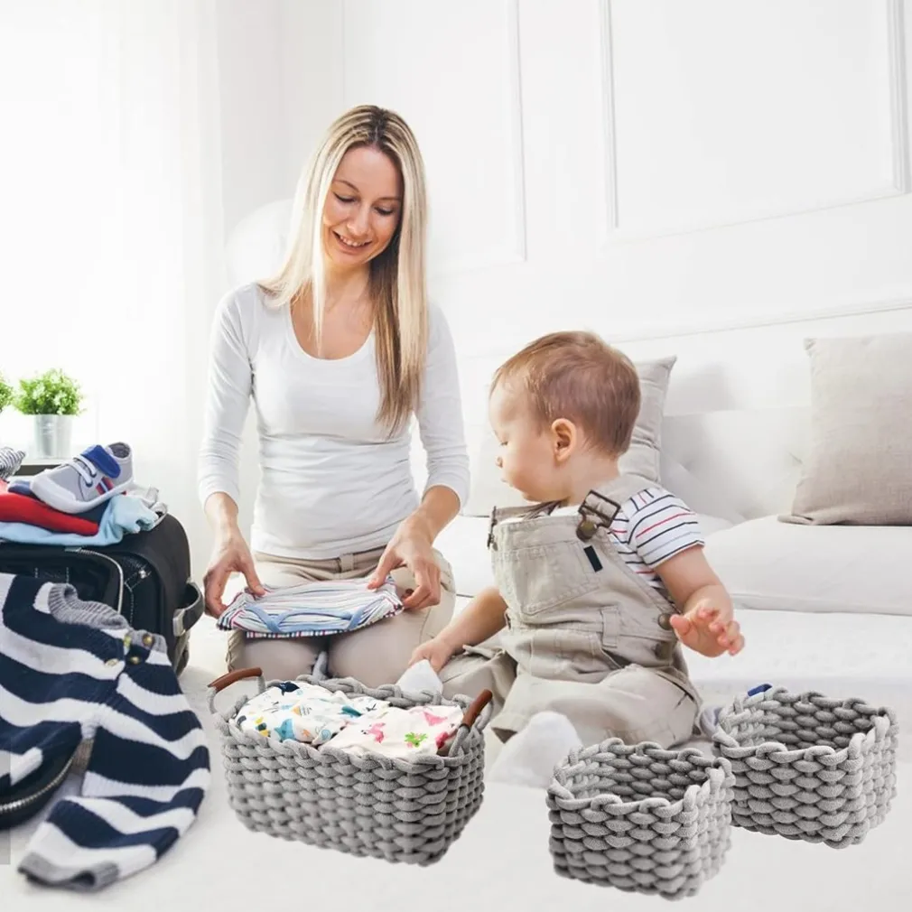 I nostri cestini sono realizzati in corda intrecciata, nota per la sua forza, traspirabilità e durata nel tempo. Questo li rende perfetti per un uso quotidiano intensivo, mantenendo sempre i vostri oggetti in ordine e facilmente accessibili. Questo set include tre pezzi di diverse dimensioni, pensati per adattarsi a varie esigenze di organizzazione. Sono ideali per riporre pannolini, salviette, ciucci, articoli da toeletta, lozioni, giocattoli e molto altro. La versatilità di questi cestini vi permette di utilizzarli in diversi ambienti della casa.