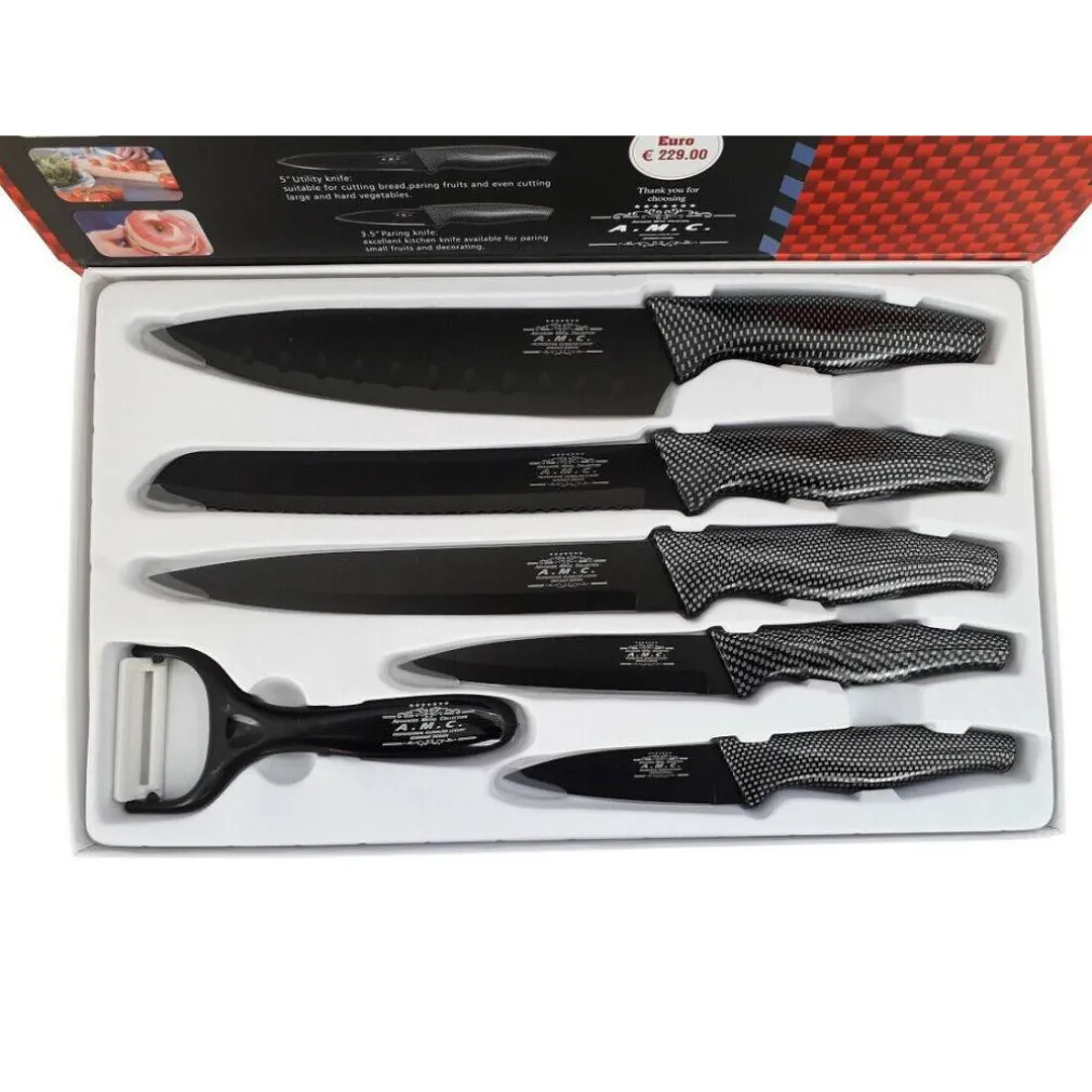 Set 5 + 1 coltelli pelapatate da cucina neri in acciaio effetto carbonio