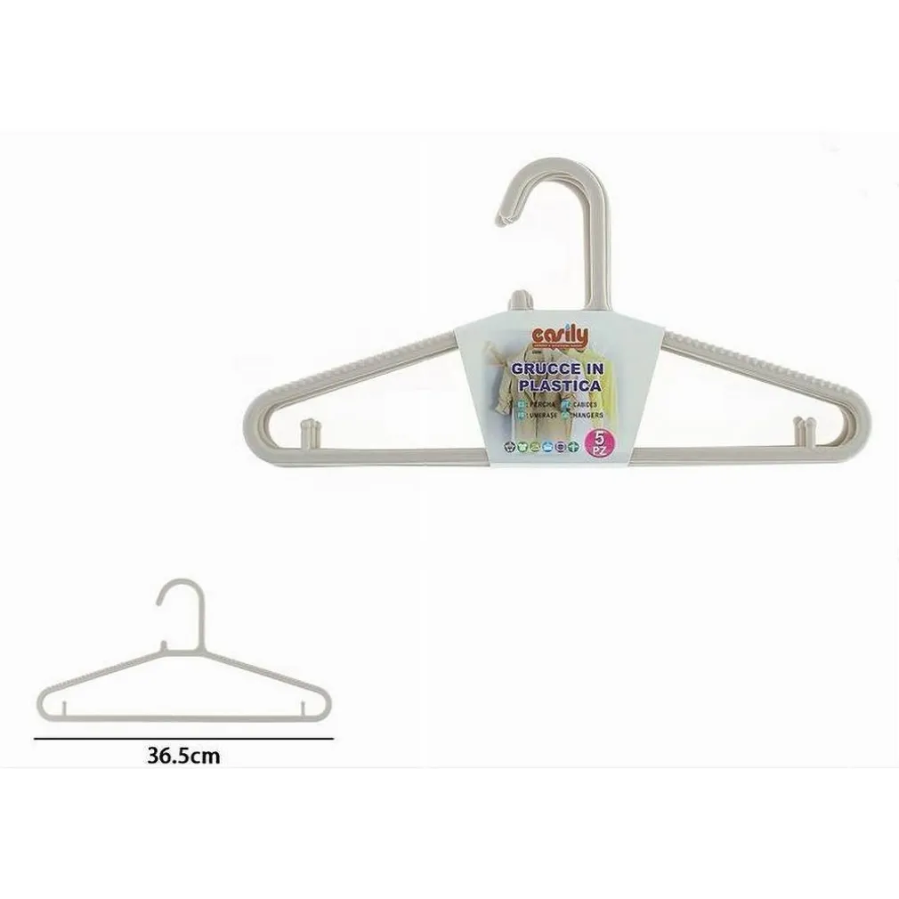 Il set include 5 grucce in plastica beige, perfette per appendere pantaloni, giacche e altri indumenti.