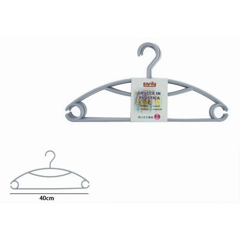 Il set include 5 grucce appendiabiti in plastica grigia, ciascuna della misura di 40 cm, ideali per appendere vestiti e pantaloni.