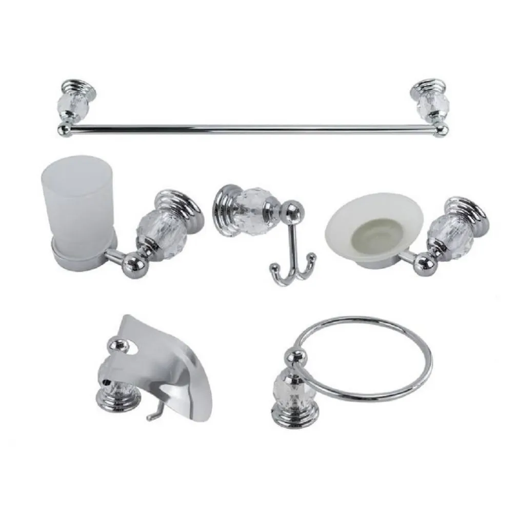 Bellissimo set da bagno dal design moderno, in acciaio lucido e vetro satinato, con pomelli in vetro trasparente intagliato. Completo di 6 pezzi: porta rotolo, porta asciugamano ad anello, porta asciugamano lungo (58 cm), bicchiere portaspazzolino, porta saponetta e gancio per accappatoio. La confezione comprende viti e i tasselli per il fissaggio.