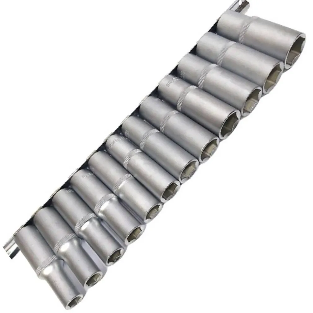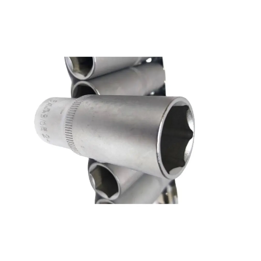 Il set 12 bussole con attacco da 1/2″ di pollice e una lunghezza di 77 mm. Le bussole, estremamente robuste, sono realizzate in acciaio al cromo vanadio.