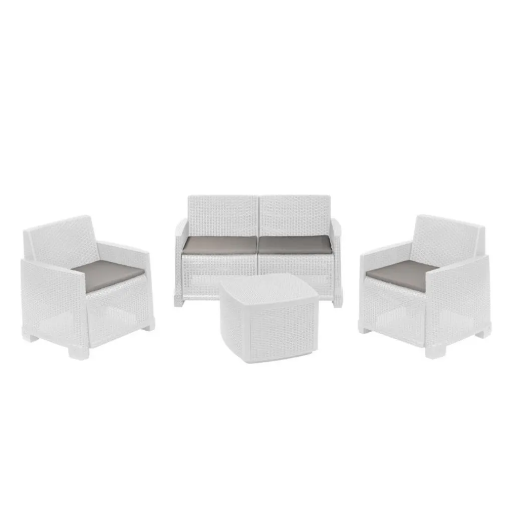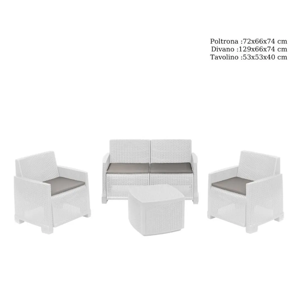 La struttura è interamente in polipropilene, noto per la sua resistenza agli agenti atmosferici, ai raggi UV e alla deformazione. I cuscini, invece, sono realizzati in poliestere idrorepellente, facilmente lavabile e confortevole.