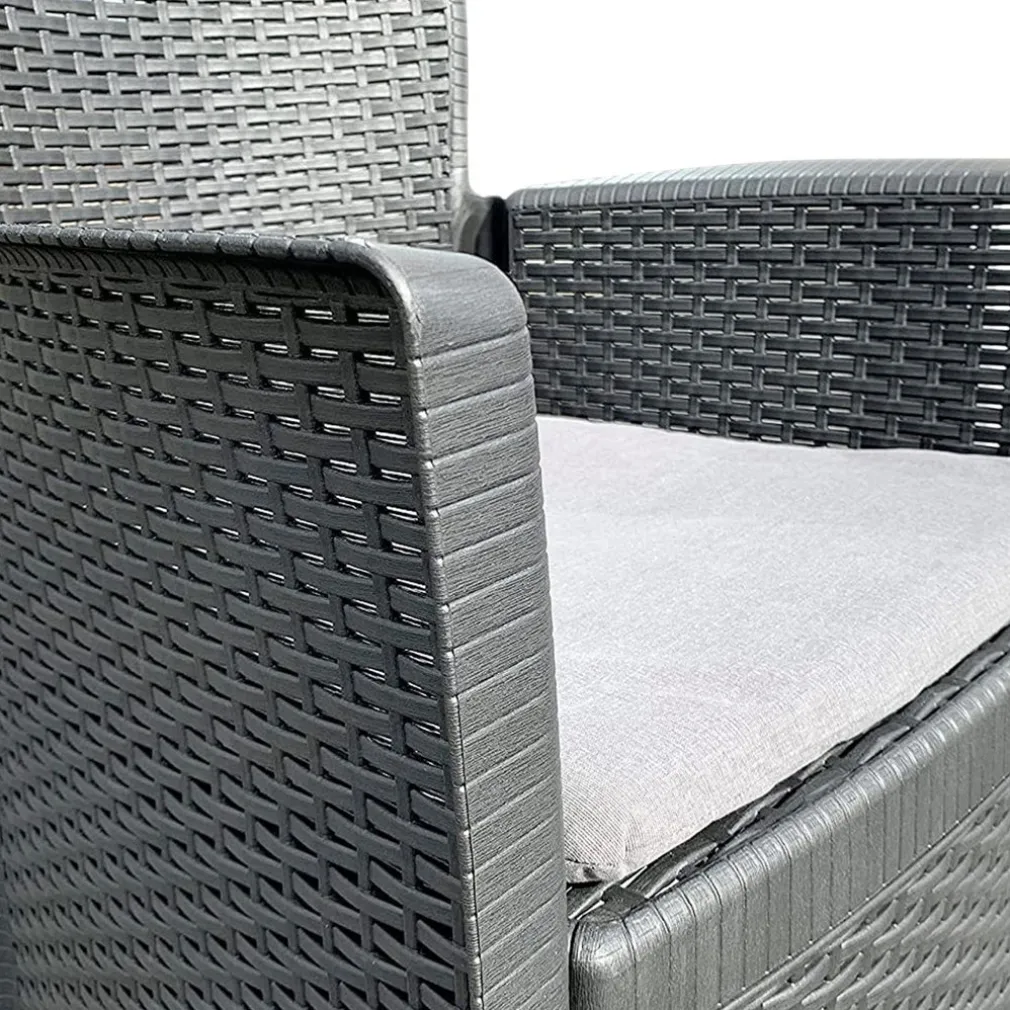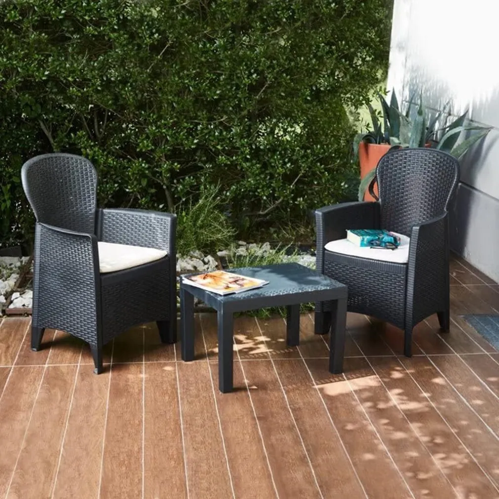 Il Set Akita è stato pensato per chi desidera arredare con gusto anche ambienti outdoor di dimensioni ridotte. La struttura in resistente polipropilene effetto rattan garantisce una lunga durata nel tempo e una manutenzione minima. Il suo design moderno e compatto lo rende perfetto per terrazze, balconi o piccoli giardini, senza rinunciare all’eleganza.