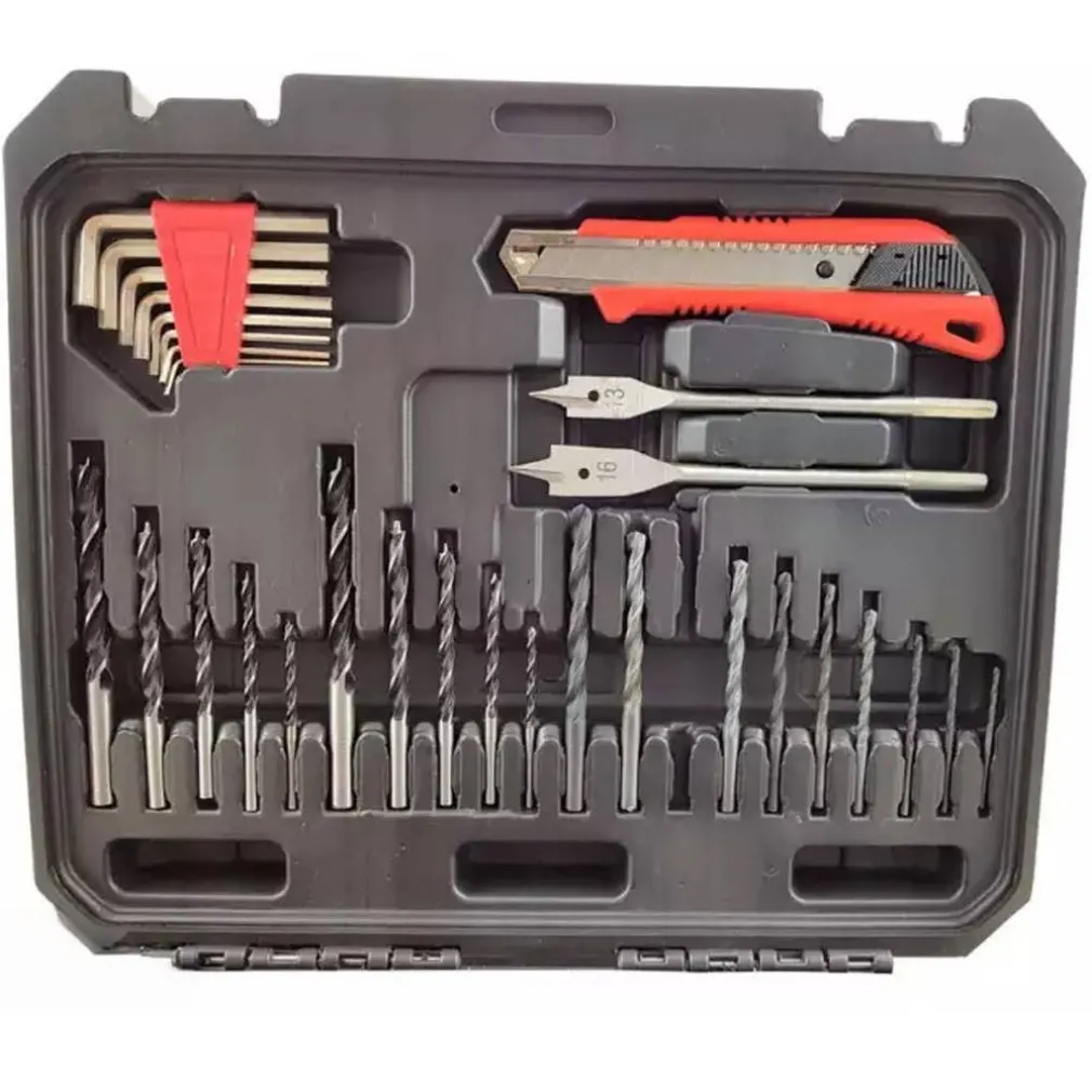 Che tipo di attrezzatura è inclusa nel set? Il set comprende una vasta gamma di accessori, tra cui bit, trapani, punte, un coltello, una torcia elettrica, e molto altro, offrendo una soluzione completa per tutte le vostre esigenze di foratura e avvitamento.