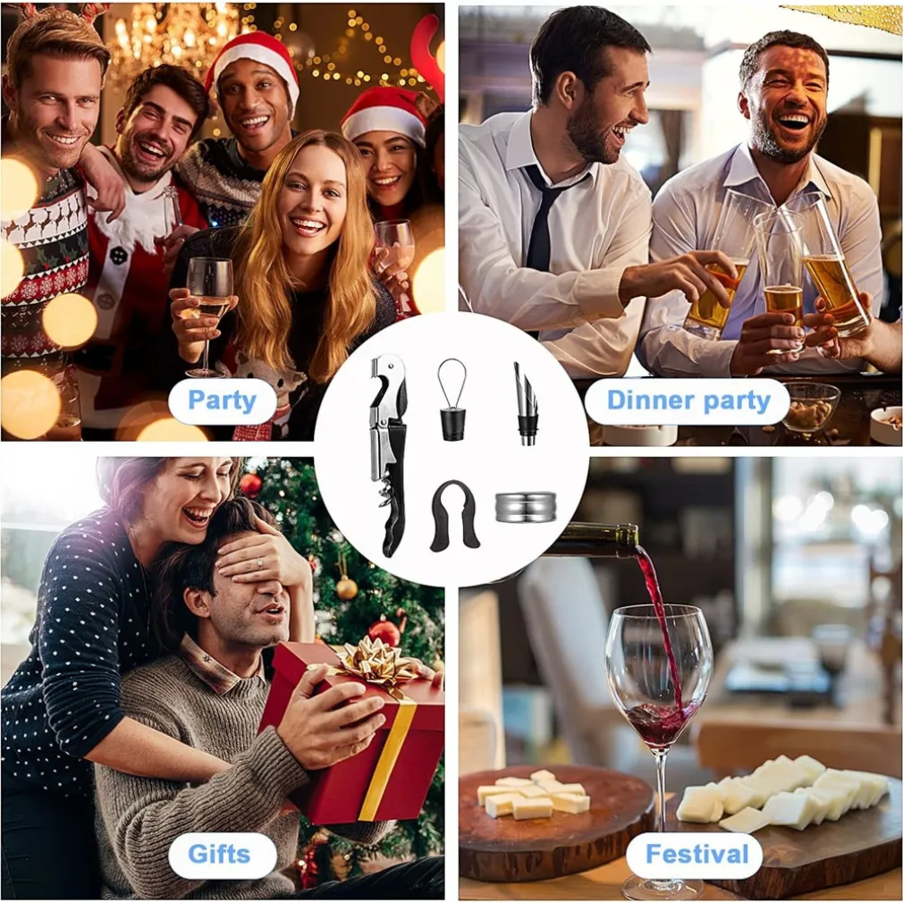 Sei alla ricerca del miglior set di cavatappi multifunzione per aprire, versare e conservare il vino in maniera impeccabile? Il nostro Set Vino 5in1 è la soluzione ideale. Un kit completo che comprende tutto il necessario per goderti il tuo vino preferito in modo pratico e professionale. Che tu sia un amante del vino, un ristoratore o stia cercando un regalo unico, questo set è perfetto per ogni occasione!