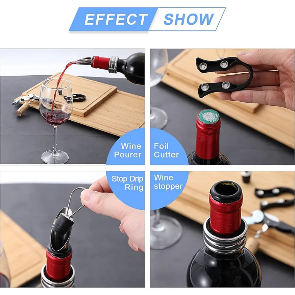 - Cosa include il set di cavatappi 5in1? Il set include un cavatappi, un taglierino per sigillo, un anello antigoccia, un versatore e un tappo per vino.