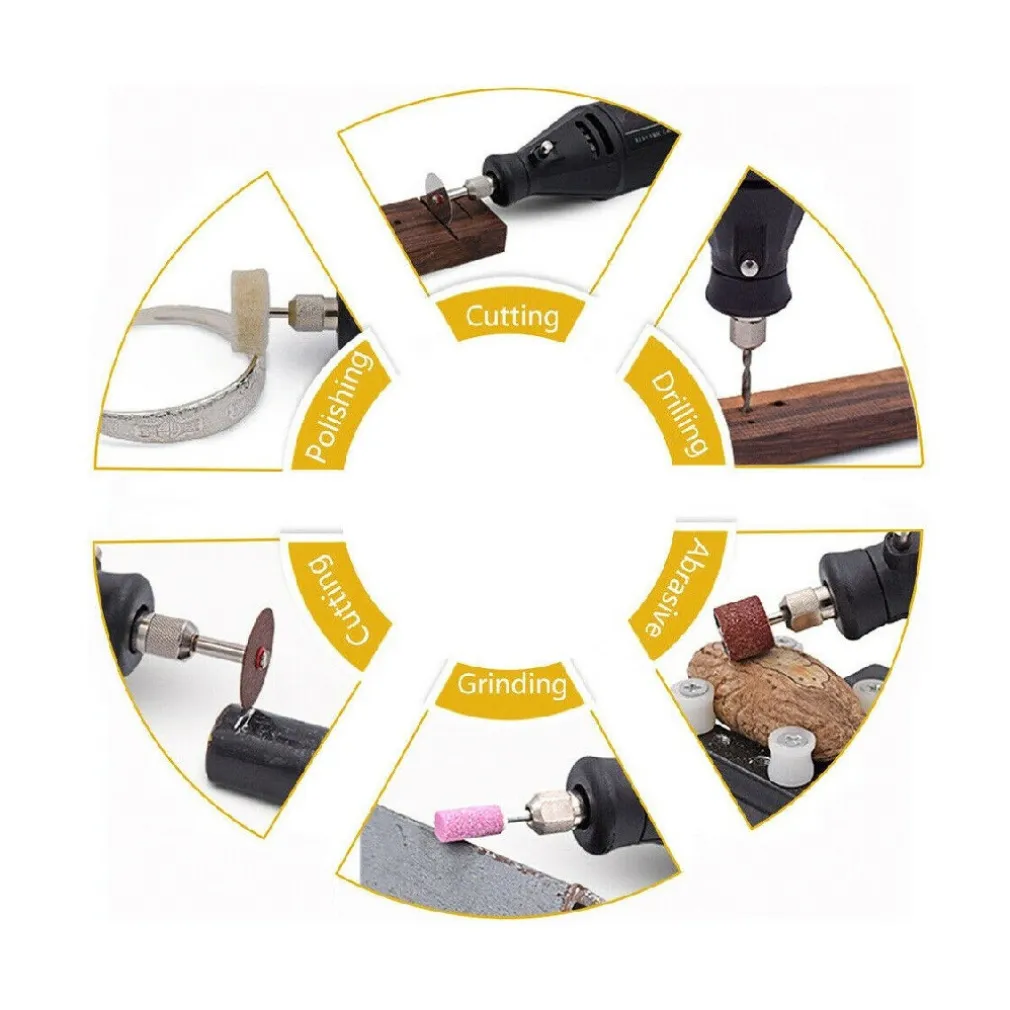 Miniutensile rotativo con albero flessibile, dremel, per fai da te, bricolage, modellismo, completo di un’ampia gamma di accessori per levigare, tagliare, lucidare, incidere, forare, ecc. Operando con l’albero flessibile, il quale dispone alla fine di un mandrino di precisione, si aumenta notevolmente la precisione di utilizzo. Il tutto contenuto in una pratica valigetta. 209 accessori per tagliare, levigare, lucidare, smerigliare, pulire, forare e incidere.