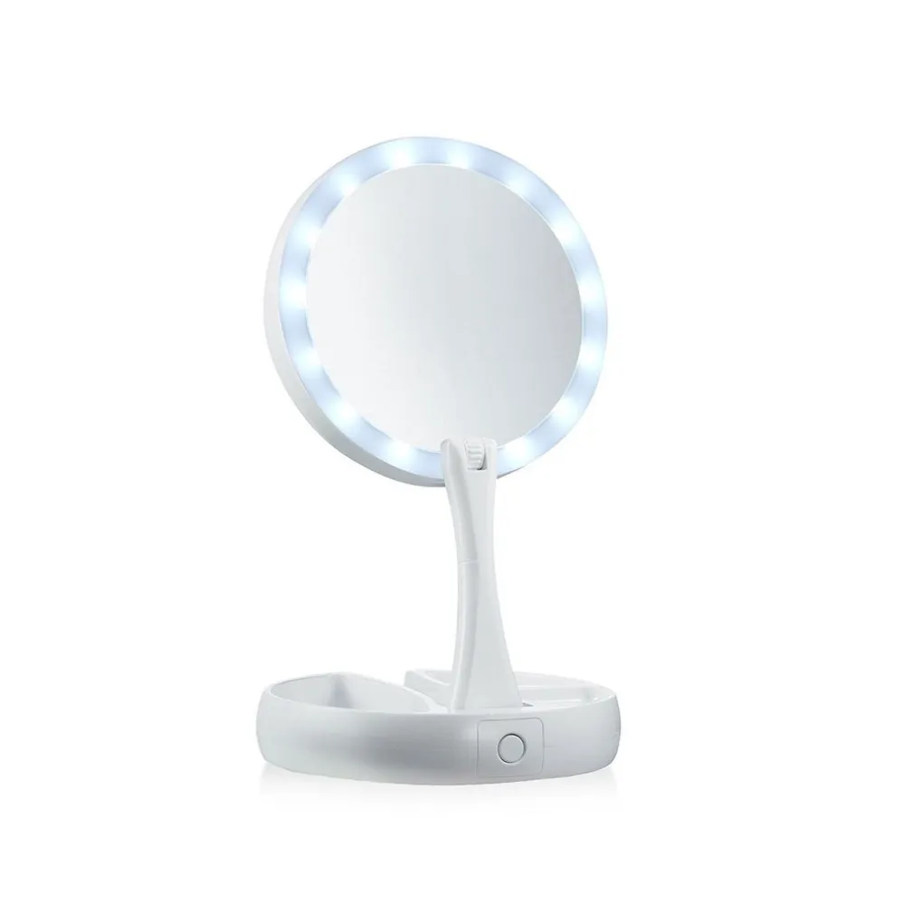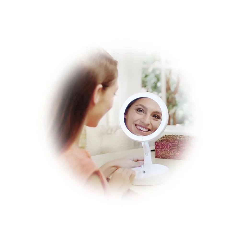 Elegante specchio da tavolo con due lati, uno normale e l’altro con triplo ingradimento, perfetto per il make up e la cura del viso. Può essere ruotato di 360° al fine di catturare la luce perfettamente. Ideale per bagno o camera da letto, è un complemento di classe, dal design minimale e raffinato, che non può mancare fra gli accessori per la bellezza di tutte le donne.