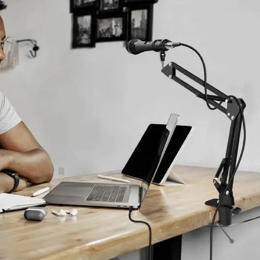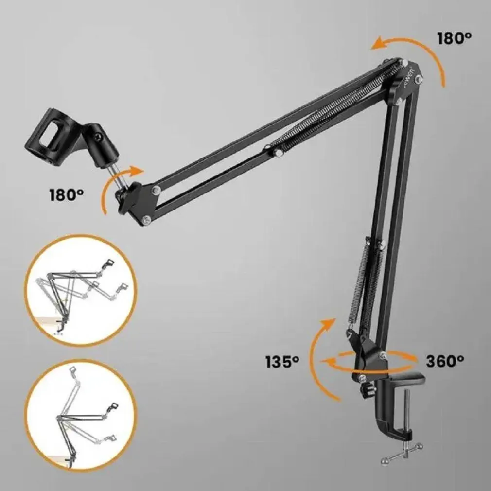 Supporto per microfono per collegare facilmente il microfono alla scrivania. Supporto da tavolo per microfono con braccio di sospensione snodato. Supporto per microfono, con attacco da tavolo con interno in espanso.