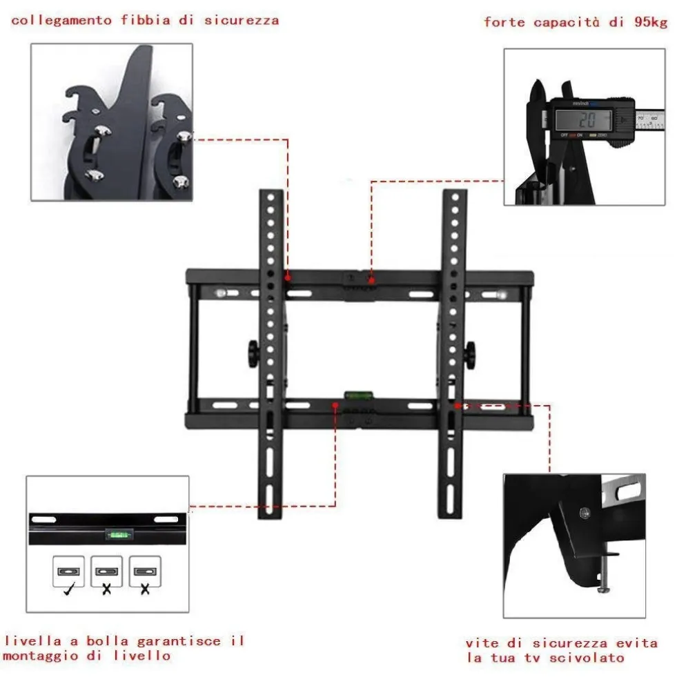 - Puoi montare Led, Lcd e Plasma con dimensioni da 23″ a 42″ e peso massimo fino a 25 Kg.