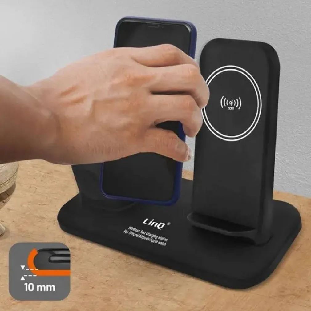 La stazione di ricarica che ci vuole per i tuoi dispositivi apple, ideale per gli usi quotidiani, questa stazione di ricarica della marca linq è una soluzione 3 in 1 che ti permette di ricaricare i dispositivi apple più diffusi. Infatti integra: una base a induzione qi da 10w per ricaricare l’iphone oppure altri smartphone compatibili con la ricarica rapida qi; un connettore lightning che eroga una potenza di 3w e permette di alimentare gli airpods; un caricatore magnetico da 2w per l’apple watch. Il tutto, in un design elegante e minimal, che si adatta a qualsiasi interno ed ambiente.