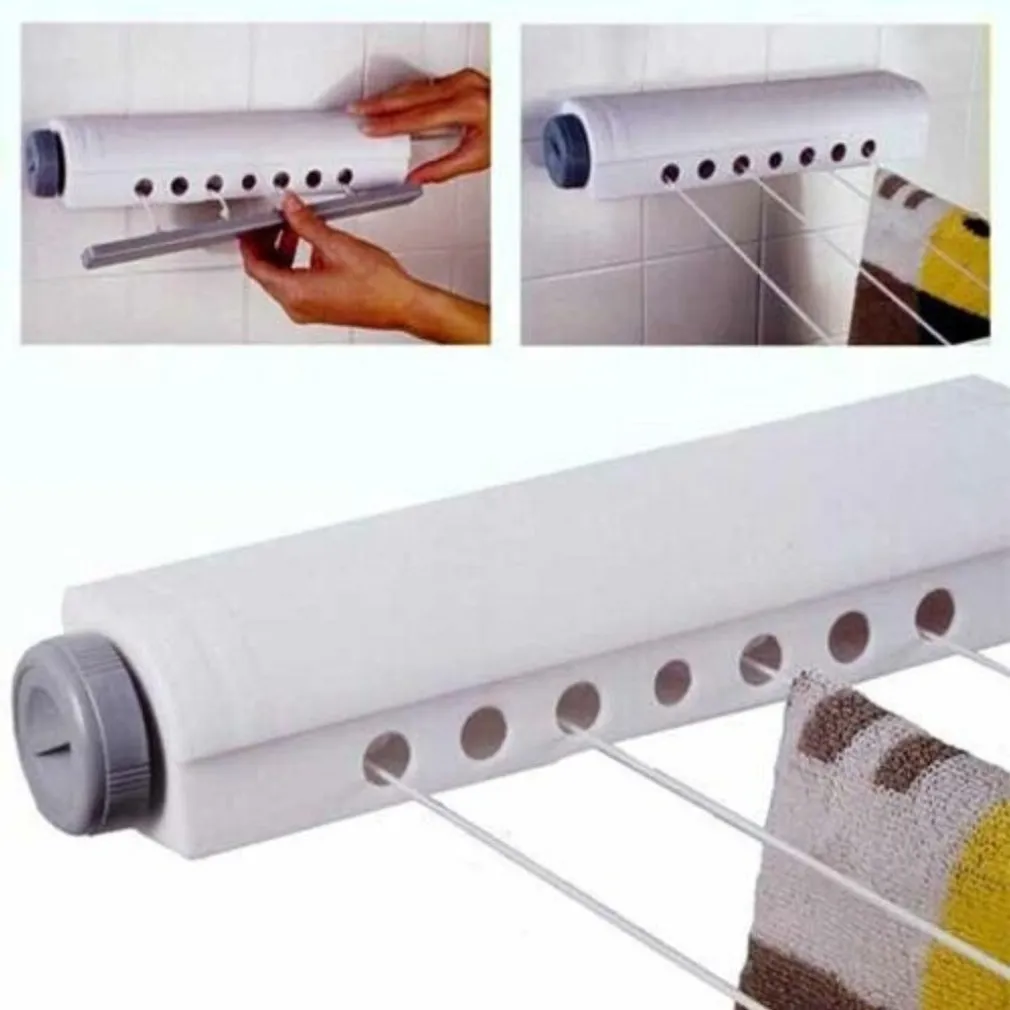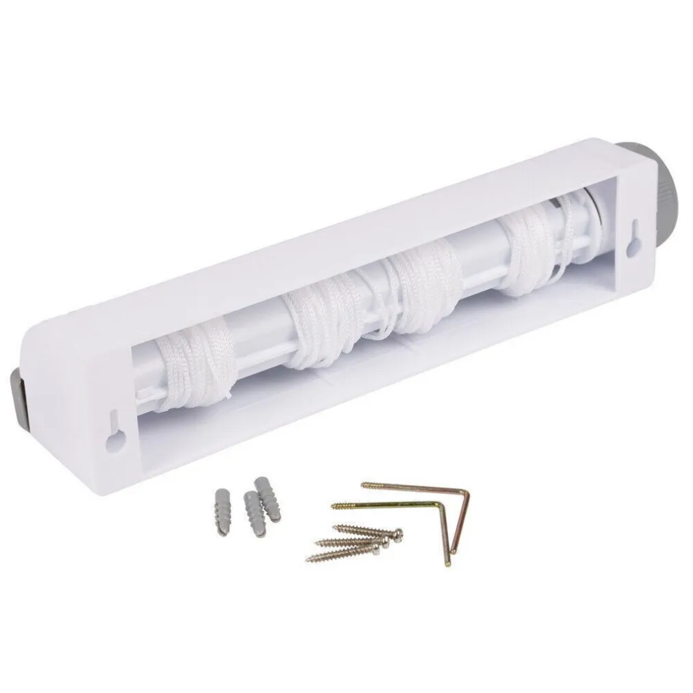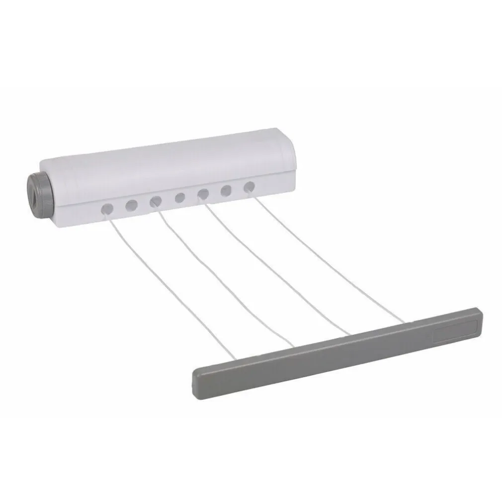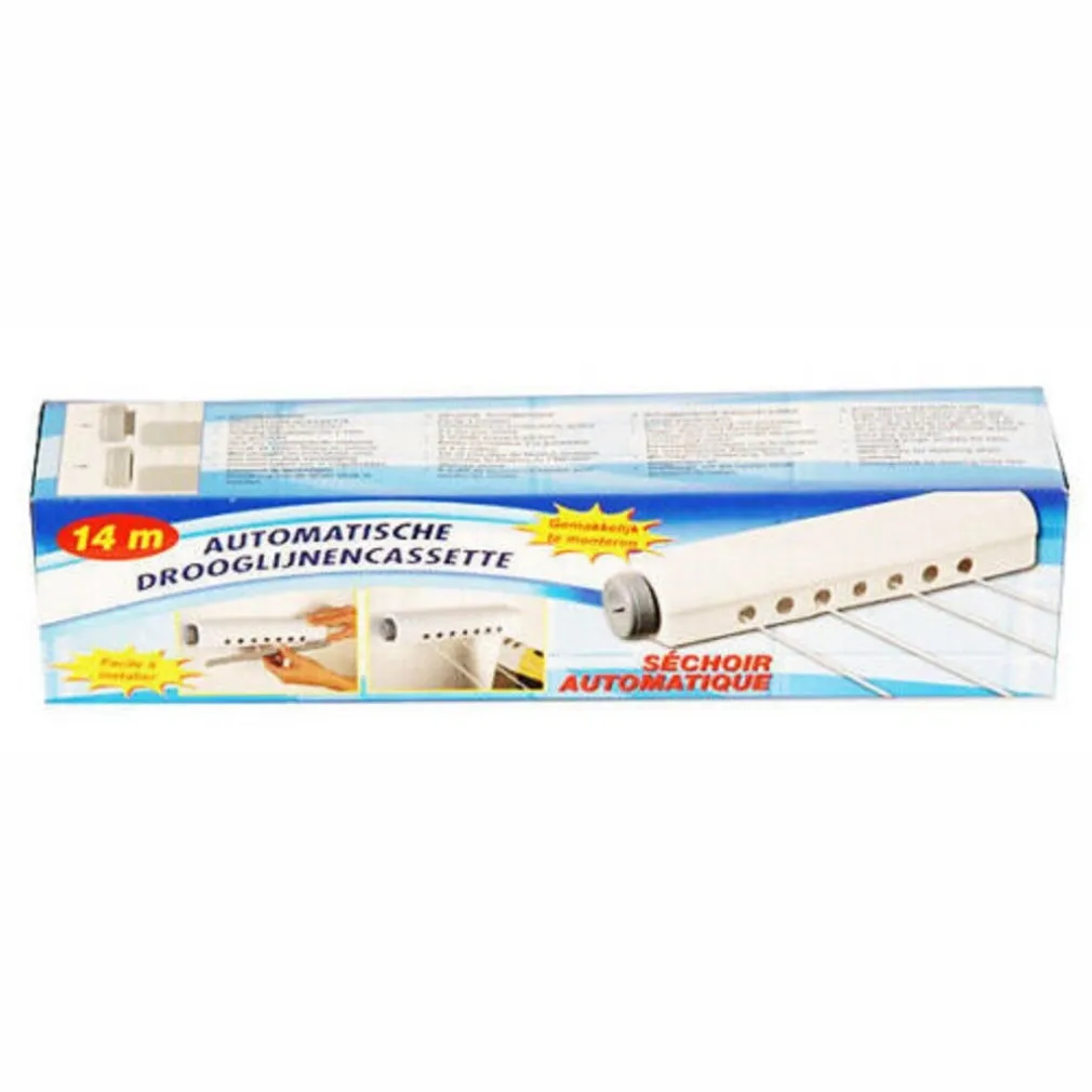 Stendino Stendibiancheria Estensibile Automatico Muro Parete Fino a 14 Metri. Stendibiancheria estensibile, con cassetta di riavvolgimento per mantenere le corde pulite, rotella per estendere le corde, rotella per bloccare il riavvolgimento. Facile da montare, si può utilizzare sopra la vasca o montare a muro con le viti (incluse).