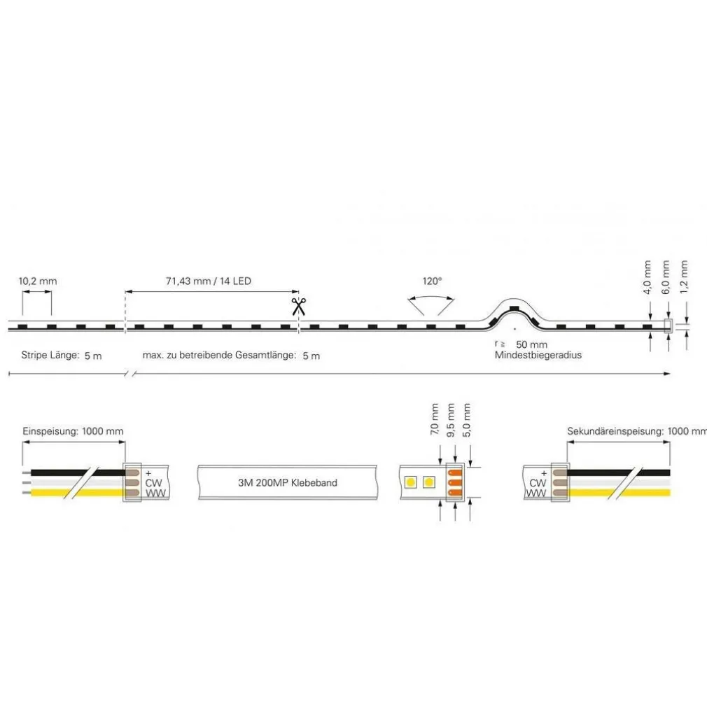 La striscia ha un angolo di luce diffuso di 120 gradi con una resa cromatica maggiore di 90 indice di qualità. Per gestire tutte le funzioni e per cambiare la temperatura luce, la striscia necessita di una centralina CCT (non inclusa), attraverso la centralina è possibile anche dimmerare l’intensità della luce. Possibilità di collegarla a centraline WiFi per gestirla da remoto o tramite gli assistenti vocali.