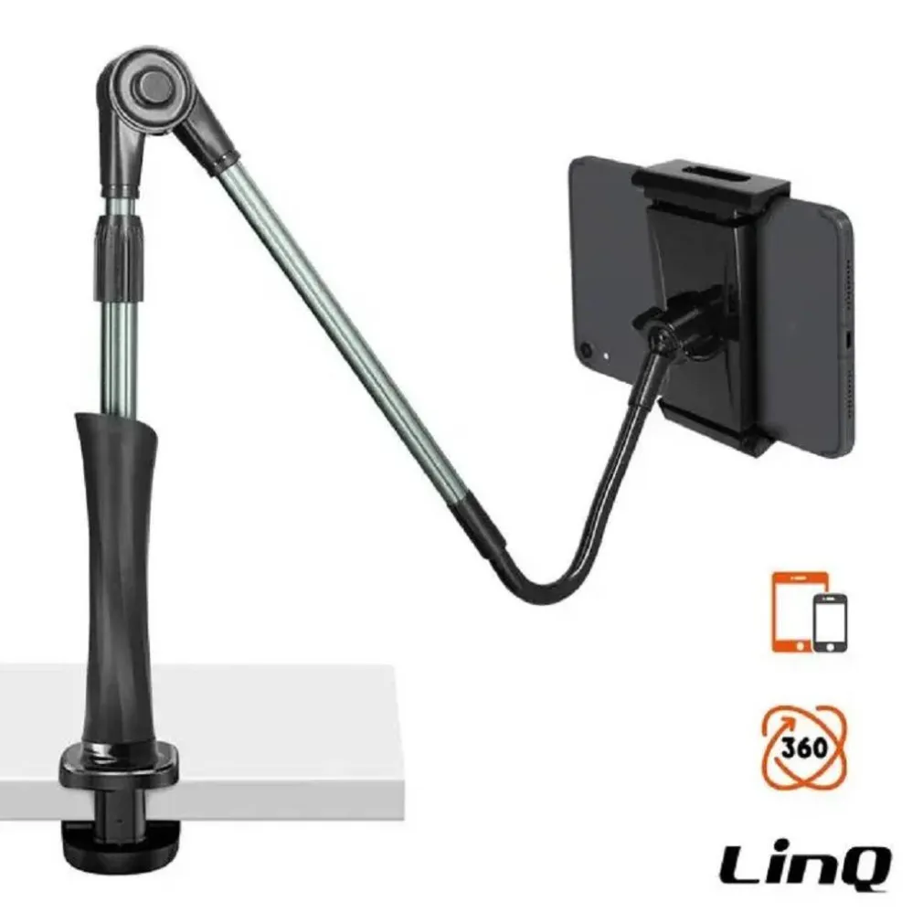 Un supporto da tavolo per mantenere il tuo dispositivo sempre in vista e facilmente accessibile in ogni circostanza. Le impugnature estensibili possono ospitare tutti gli smartphone e tablet da 4 a 6 pollici, cioè con una larghezza massima di 21 cm. Dotato di un morsetto di fissaggio per tenere il tuo dispositivo sulla scrivania, in cucina o sul comodino. Potrai guardare film, seguire ricette di cucina o fare una videochiamata senza dover tenere il tuo dispositivo. Dotato di un meccanismo di rotazione a 360°, ti consente di posizionare il dispositivo in orizzontale o verticale. Il braccio regolabile permette di regolare l’angolo per una visione confortevole in tutte le posizioni. Realizzato con materiali di qualità, mantiene lo smartphone al suo posto, anche su strade accidentate o in caso di movimenti bruschi. Il morsetto si fissa sul bordo dei mobili con uno spessore massimo di 7,5 cm.