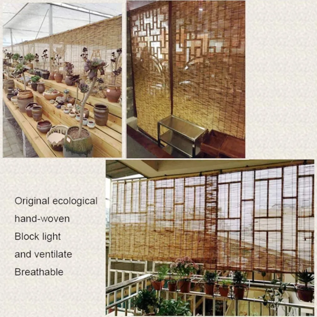 Tapparella di listelli con corda per un facile arrotolamento e supporto in legno con ganci in metallo per un facile montaggio a parete.