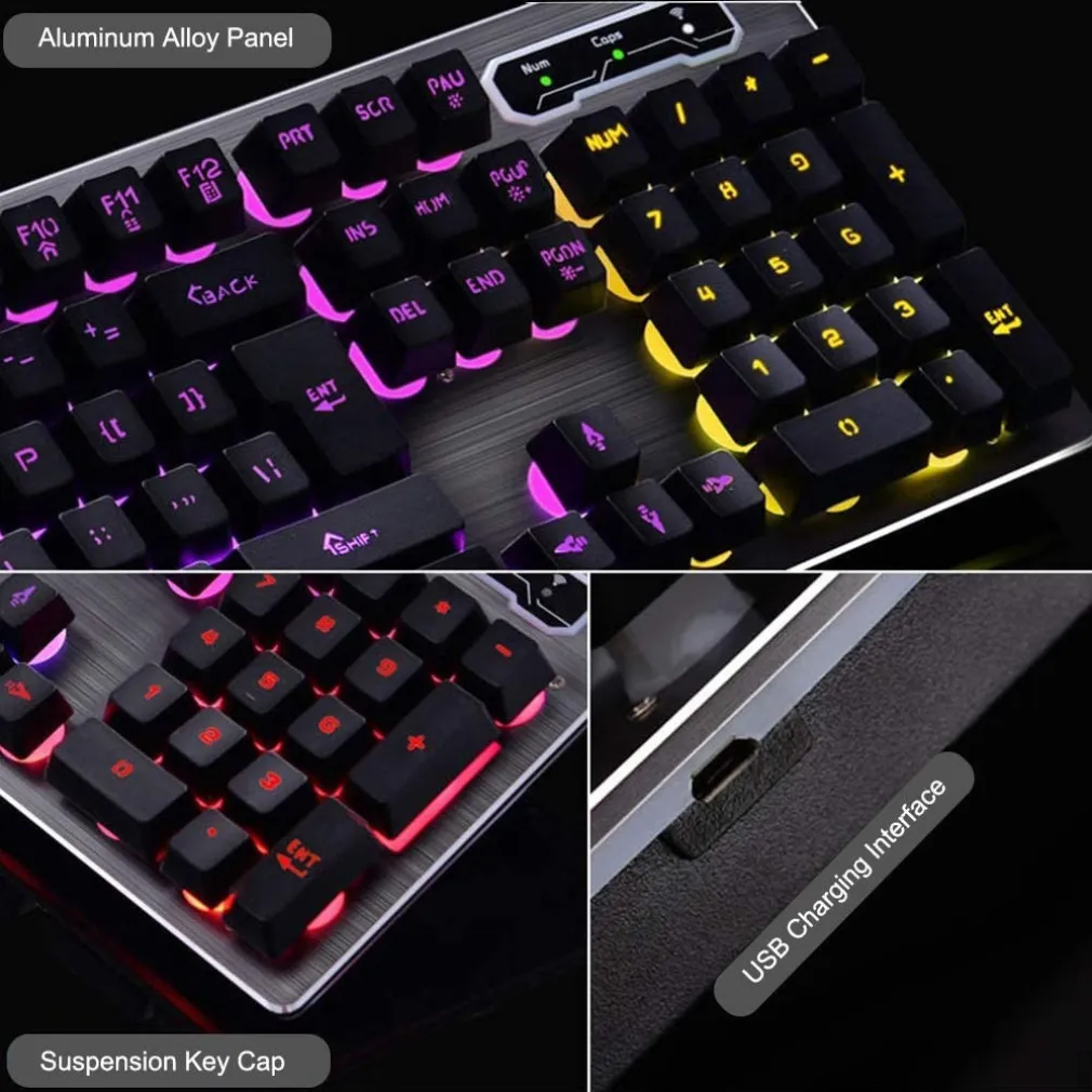 Fantastica tastiera da gioco retroilluminata arcobaleno con design a lampada respiratoria. Tasti mobili appositamente progettati per un gioco più confortevole. Ti offre tre modalità di commutazione della luce arcobaleno per un aspetto della tastiera più alla moda!