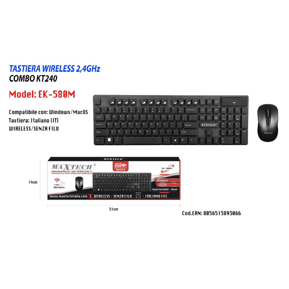 TASTIERA WIRELESS MOUSE WIFI IMPERMEABILE 2.4GHZ MAXTECH EK-580M PER COMPUTER PC