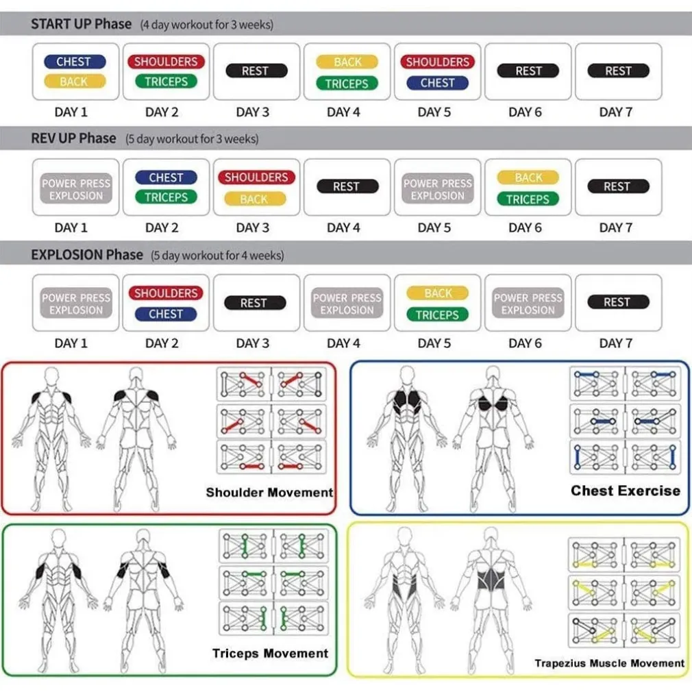 - Allenamento completo: Grazie ai colori codificati, ogni area (petto, spalle, schiena, tricipiti) viene stimolata in modo specifico.