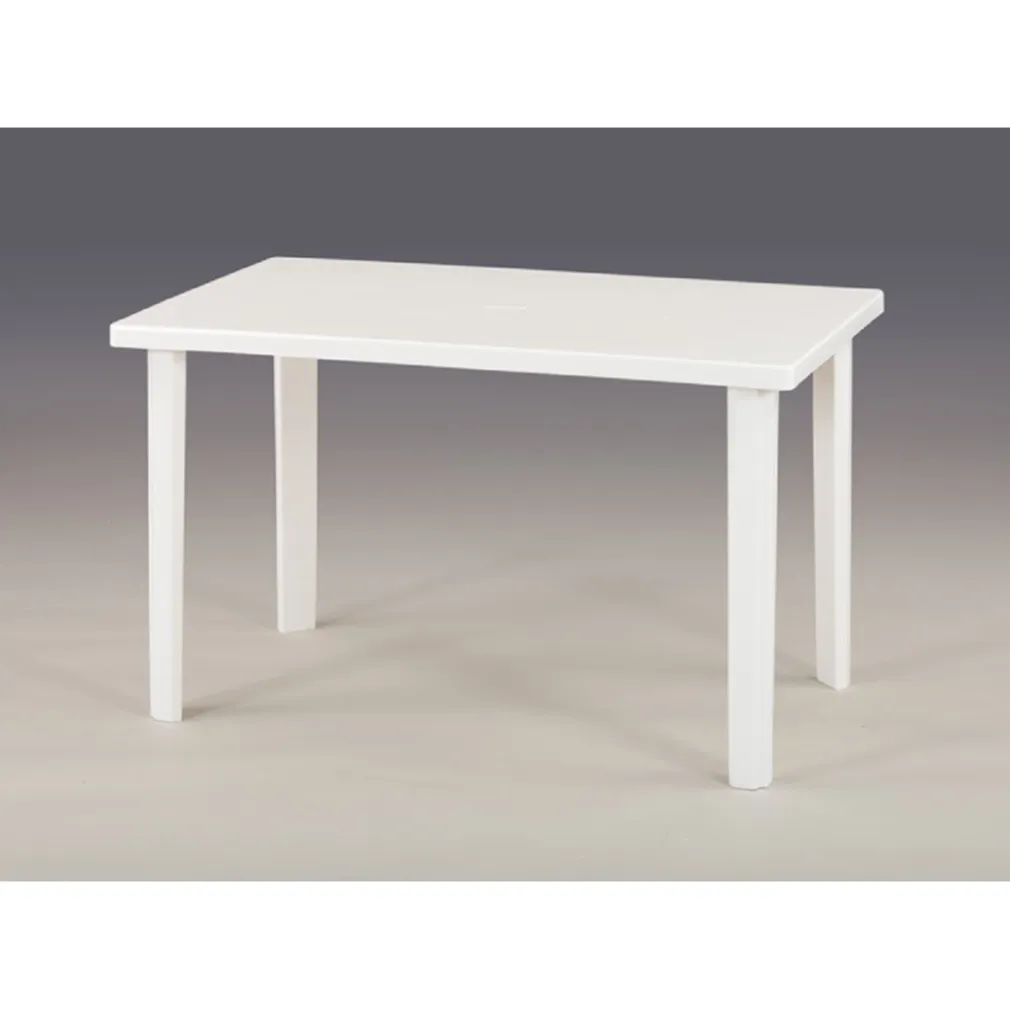 Il tavolo rettangolare 120x70cm bianco è realizzato in plastica resistente agli agenti atmosferici, con una finitura lucida che lo protegge dai raggi UV e dalla pioggia, garantendo lunga durata nel tempo.