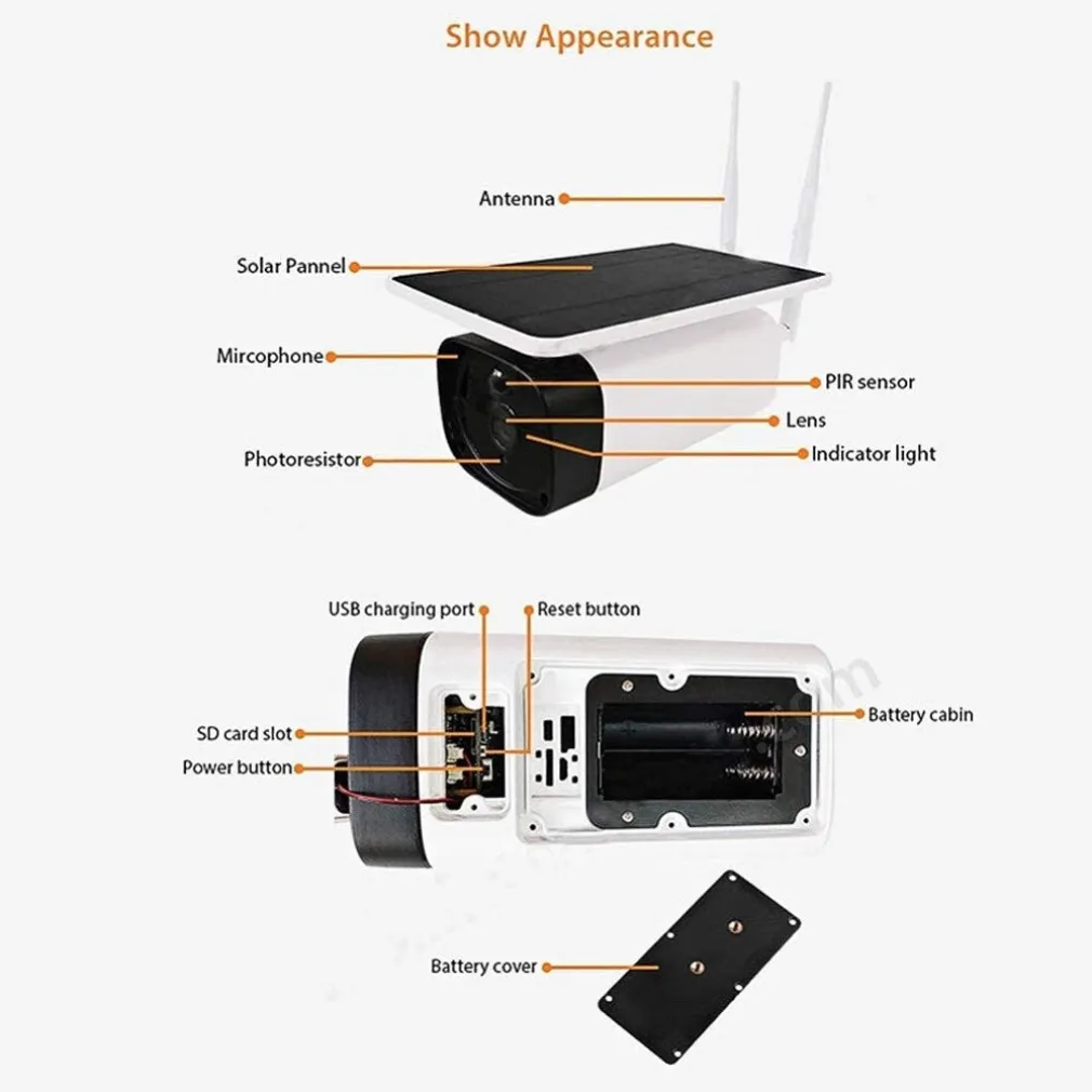 Alimentazione solare e interfono a due vie. Modalità di alimentazione semplice, alimentata da pannelli solari da 5 w e 4 batterie al litio ricaricabili da 3,7 v 18650 (non incluse), può anche essere alimentata tramite cavo usb e adc raccoglie automaticamente i dati di alimentazione della batteria per indicare bassa potenza; citofono a due voci, monitoraggio a distanza. Microfono incorporato, altoparlante, gli utenti possono monitorare tramite l’app mobile e possono realizzare video rem.