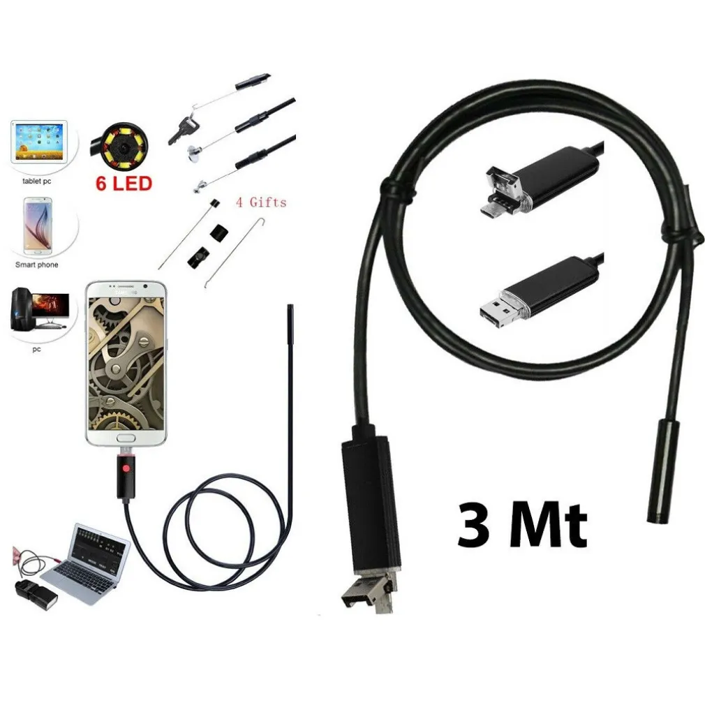 TELECAMERA ENDOSCOPICA 6 LED TUBO FLESSIBILE USB 3 MT IMPERMEABILE ISPEZIONE