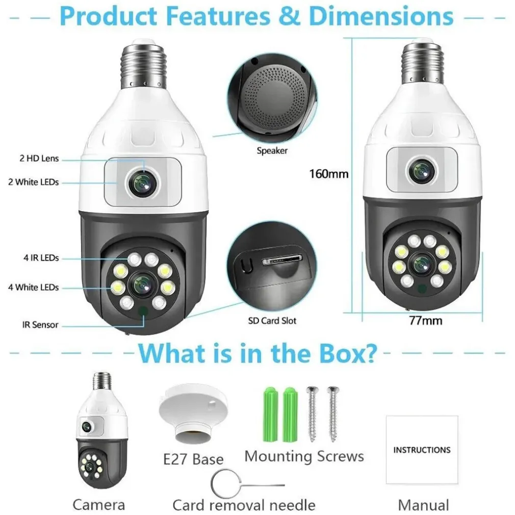 Scopri la rivoluzionaria Telecamera Lampadina WiFi da Interno ed Esterno da 5MP, un dispositivo unico nel suo genere che combina la praticità di una lampadina con la tecnologia avanzata di sorveglianza.