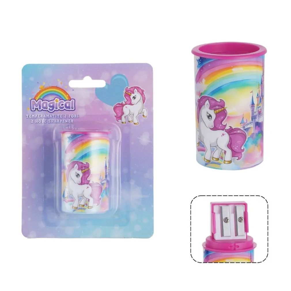 Il temperamatite doppio foro, cilindrico, tema UNICORNO si distingue per il serbatoio integrato, il design ergonomico e l’estetica fiabesca, ideale per le bambine. Non è solo uno strumento scolastico, ma un vero e proprio accessorio di stile.