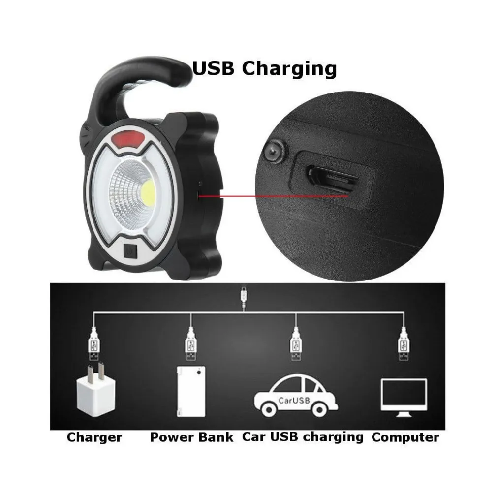 Torcia led cob emergenza da lavoro ricaricabile usb faro portatile ricaricabile con indicatore di carica della batteria, ideale da utilizzare in tutti quei luoghi in cui si necessita di illuminazione e non è presente una fonte elettrica per l’alimentazione come in campeggio, durante la pesca o per lavori in auto.
