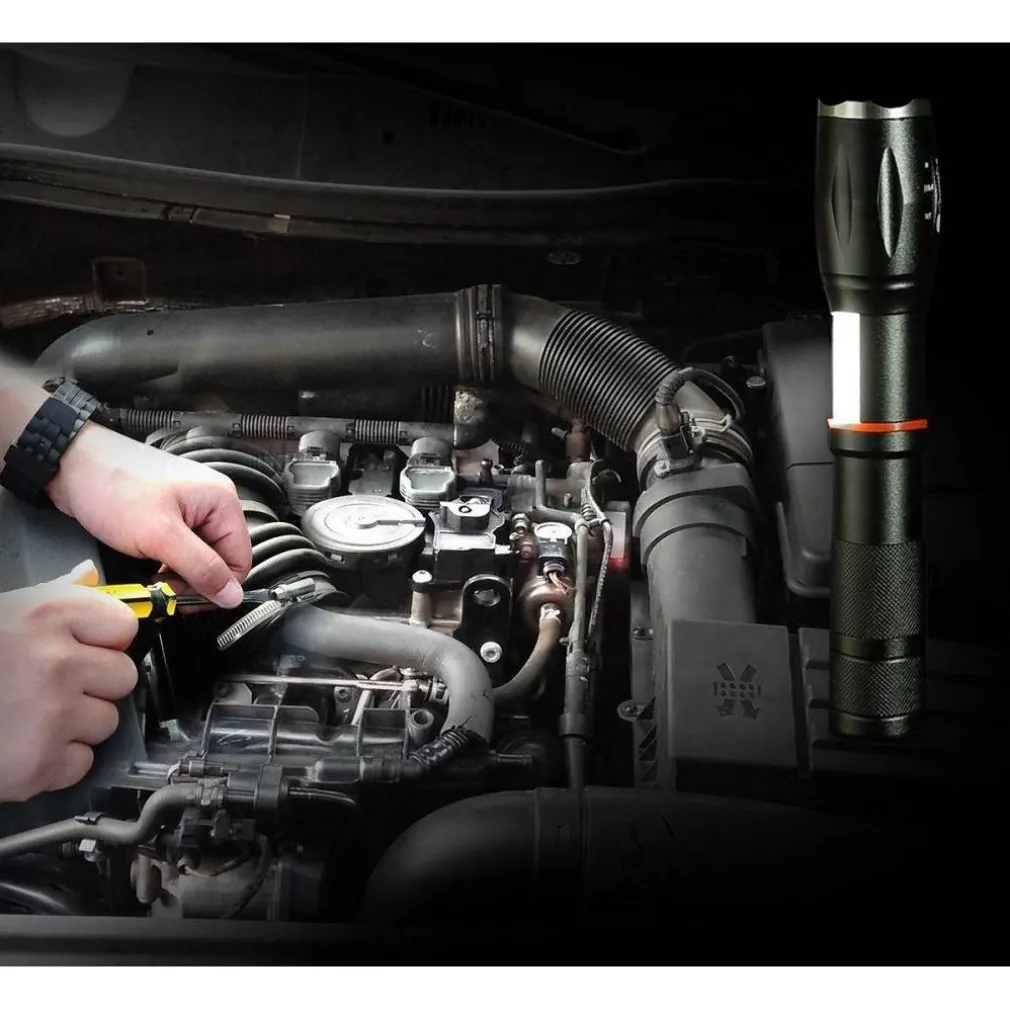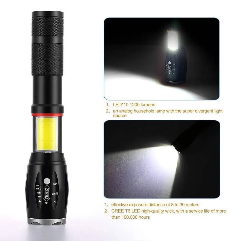 Questo prodotto combina le funzioni di torcia elettrica, illuminazione COB e luce SOS. Usato come torcia tattica dal Corpo dei Marines, con qualità militare ed affidabile, è un’attrezzatura indispensabile per i viaggi, il campeggio e l’equitazione. Adotta uno stoppino CREE T6 LED importato di elevata qualità, con una durata di vita di oltre 100.000 ore: ti darà luce a sufficienza facendoti risparmiare energia. Questa torcia multiuso è realizzata in alluminio ed è estremamente resistente e leggera da trasportare.