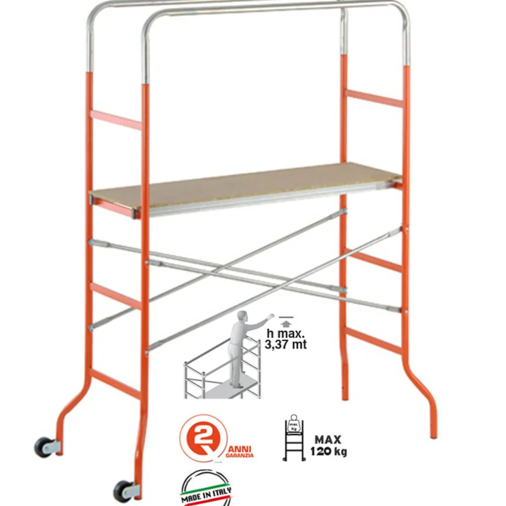 - La confezione include il trabattello in acciaio, il pianale in legno di Pino Radiata, i tiranti di sostegno, e il kit di montaggio per le ruote.