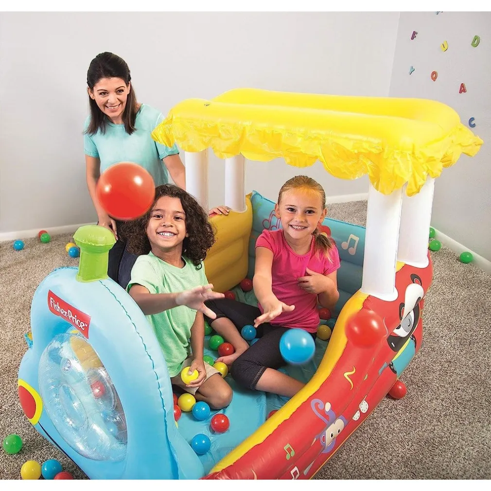 Tutti in carrozza, si parte! Creato per far divertire i bambini in completa sicurezza, il trenino gonfiabile è l’ideale per il divertimento dei bambini, sia all’aperto che nella cameretta. Coloratissimo ed interattivo, i bambini potranno giocare all’interno con le 25 palline incluse. Ha un’apertura segreta a fronte treno con funzione di entrata e uscita. Inoltre, il camino giallo posto sulla locomotiva, una volte premuto, emetterà un simpatico suono.