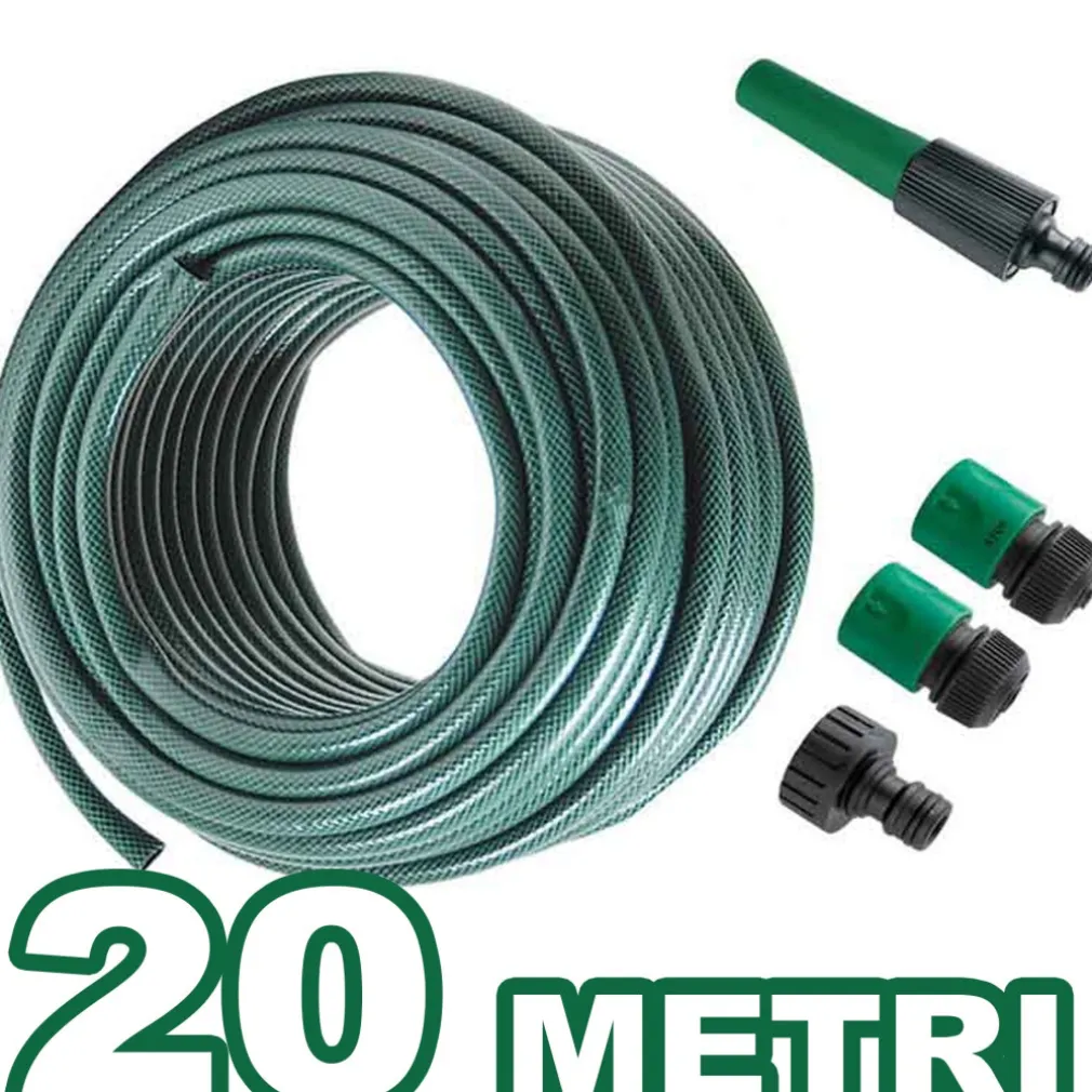 Tudo flessibile per irrigazione giardino lungo 20 metri. Composto da 4 accessori (raccordi e pistola) per la fuoriuscita del getto d’acqua senza sgocciolamenti.
