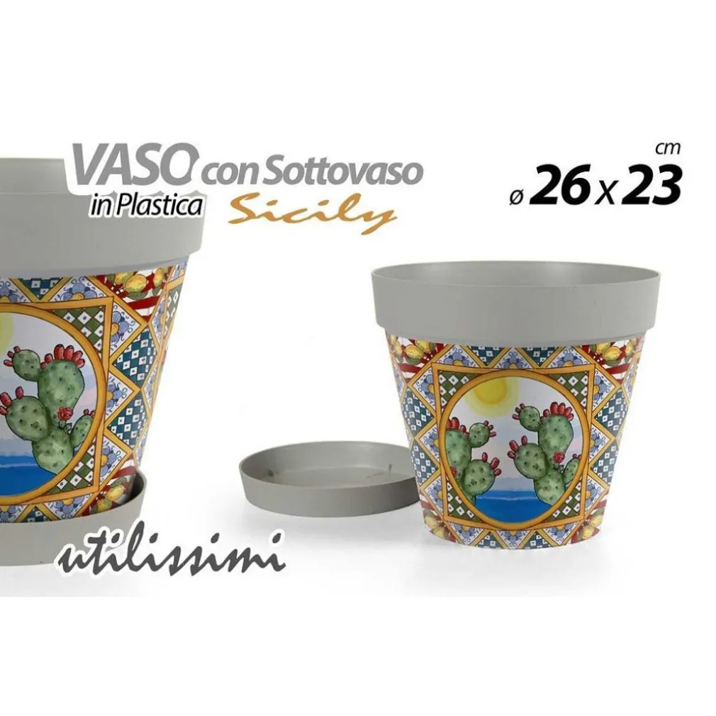Vaso con sottovaso porta piante in plastica decorato sicilia dimensioni 26 x 23 cm arredo casa giardino.