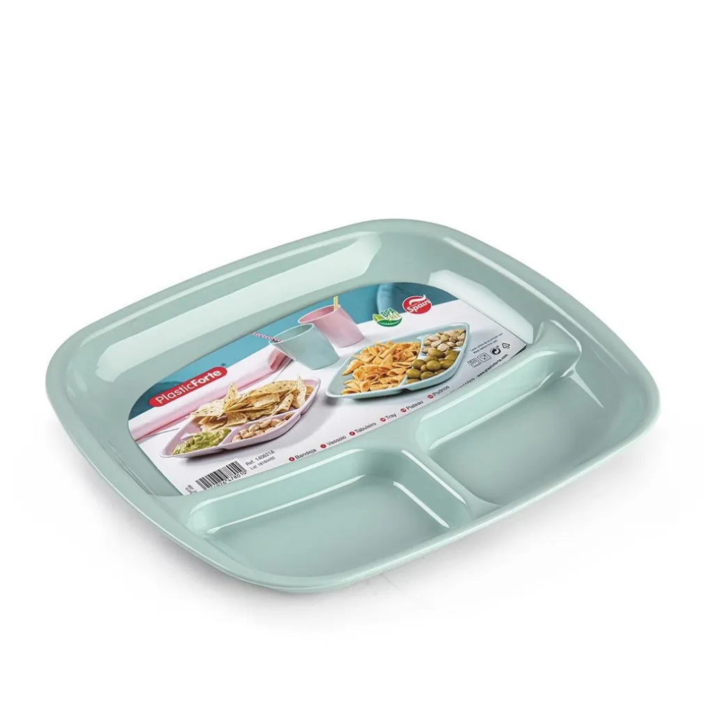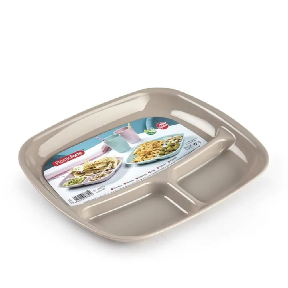 Vassoio in plastica Forte TRIO con divisori realizzati in plastica PP alimentare riutilizzabile, durevole e resistente, priva di BPA. Molto leggero, perfetto per l’uso quotidiano, merende a compleanni, feste, pic-nic, campeggio e barbecue. Può essere utilizzato anche come piatto compartimentato per i più piccoli della casa.
